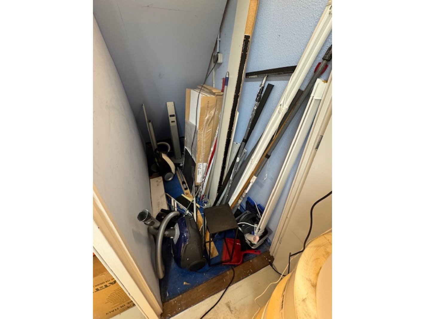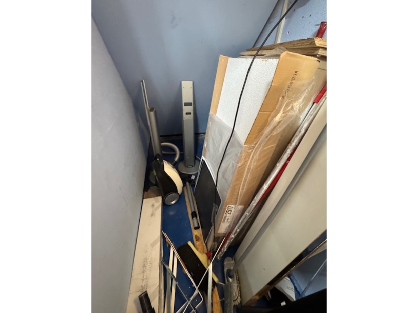 Product: inhoud trapkast Specificaties: o.a. 2 stofzuiger, plafondplaten, vloerbedekking, wandplank
