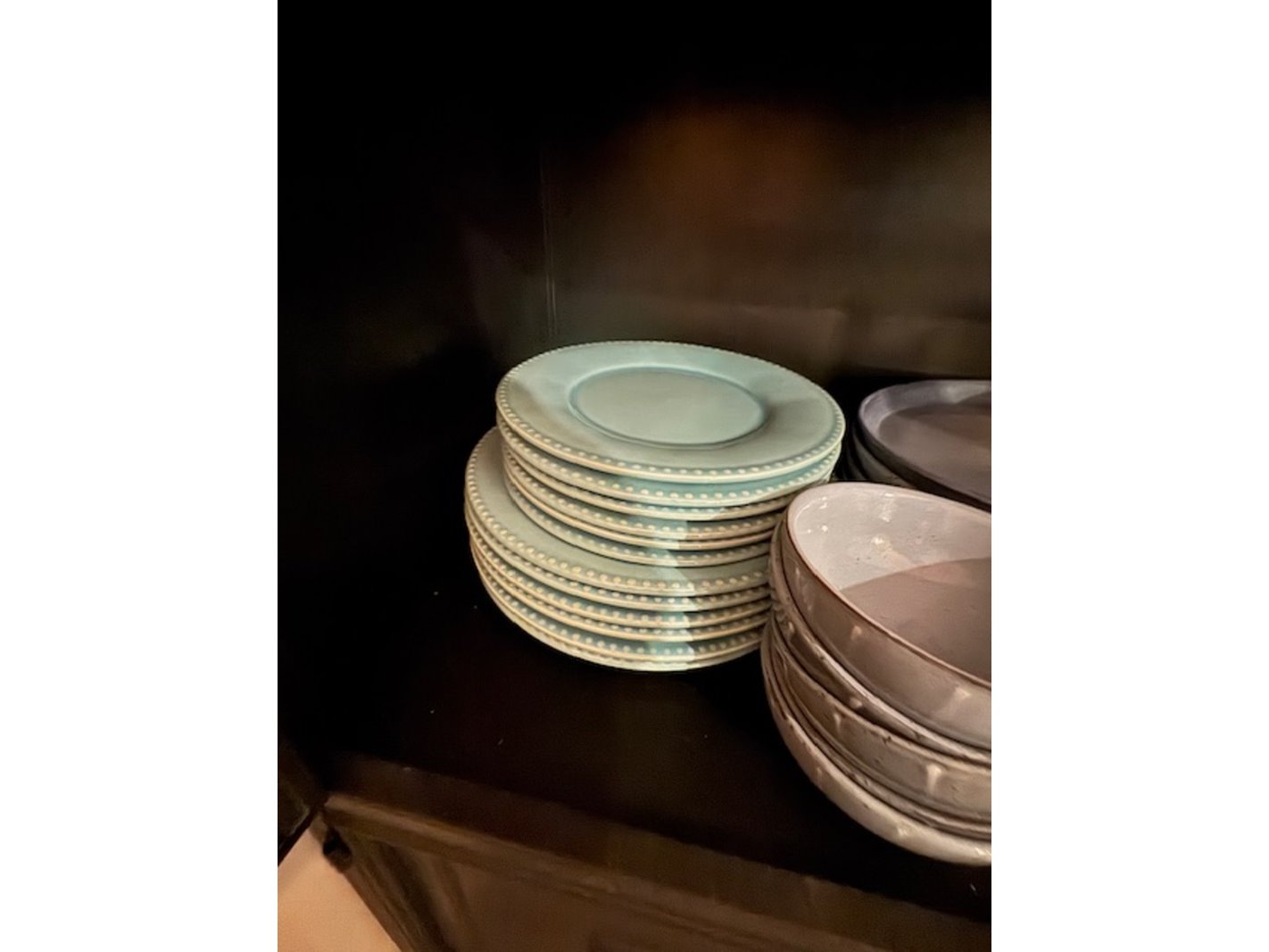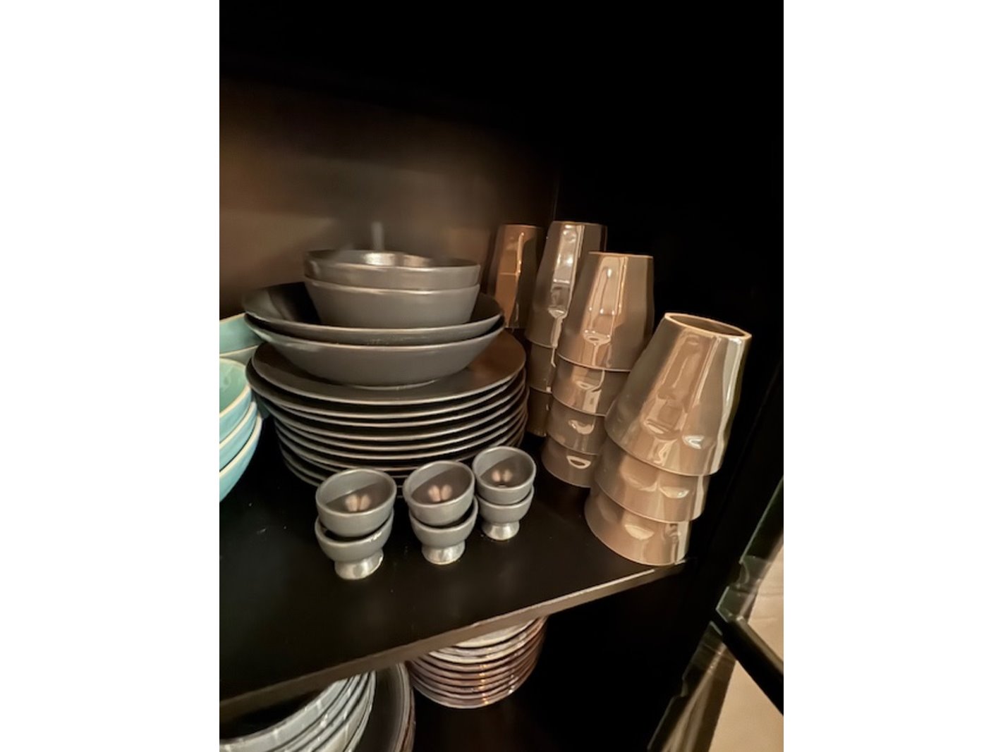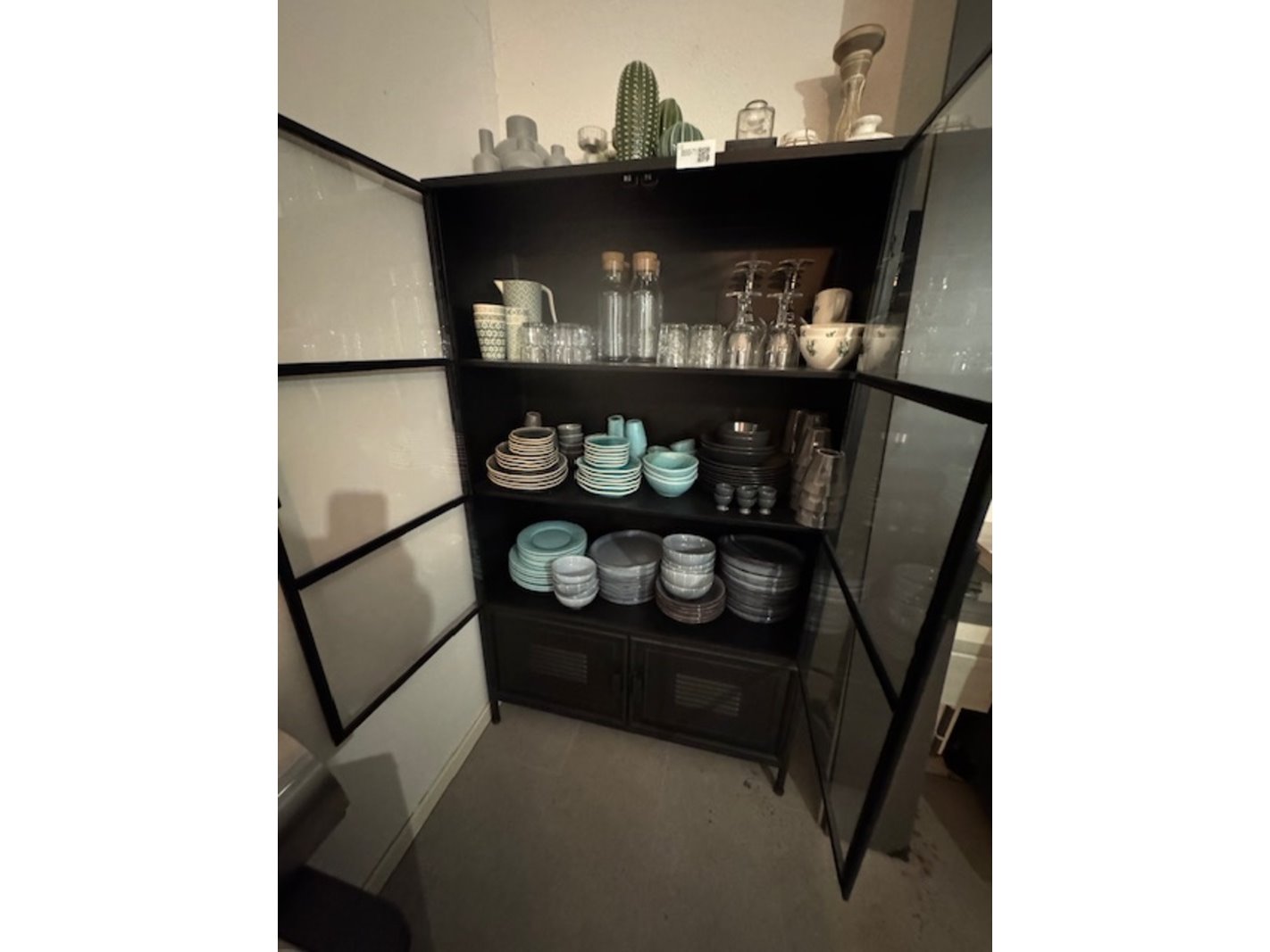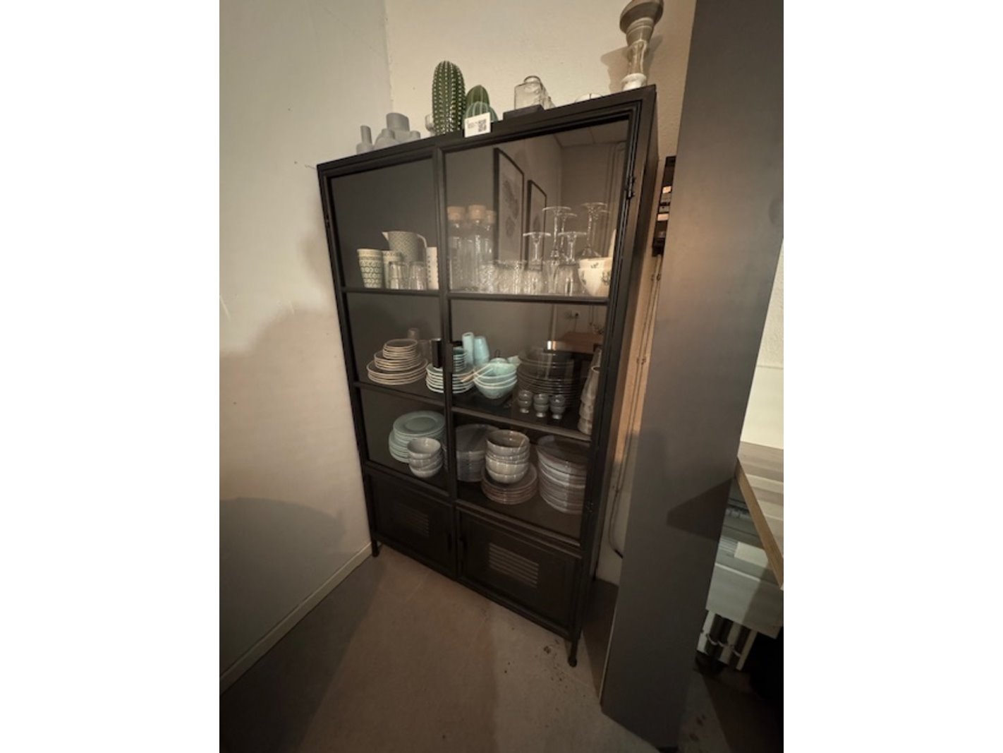 Product: Wandkast met glaswerk en serviesgoed Kleur: staal