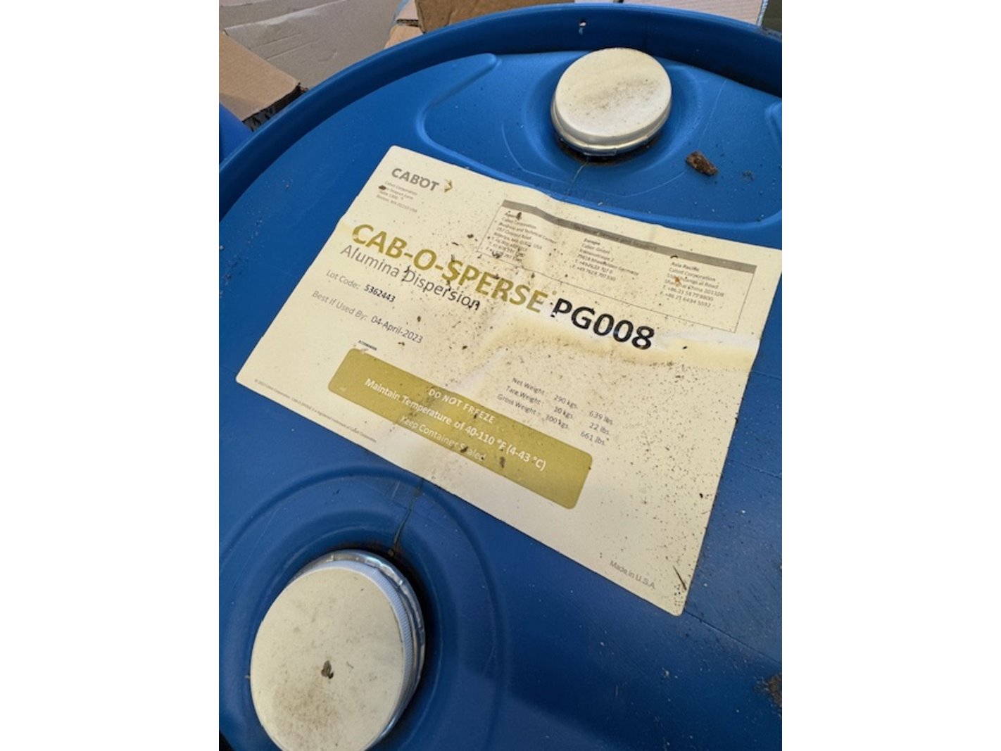 Merk: Cab-O-Sperse Product: bindmiddel / dispersie Afmeting: 290kg per vat Specificaties: CAB-O-SPERSE PG 008 is een fumed alumina (aluminiumoxide) product van Cabot, gebruikt in coatings voor inkjetmedia, bekend om zijn snelle inktadsorptie en droging. Fumed alumina (aluminiumoxide) is een fijnverdeelde vorm van aluminiumoxide. Het product is een dispersie, wat betekent dat de deeltjes verspreid zijn in een vloeistof, klaar voor gebruik. Toepassingen: Coatings voor inkjetmedia: Vooral inktjetpapier en andere substraten die snelle inktadsorptie en droogheid vereisen. Verbetering van printkwaliteit: Zorgt voor snelle inktopname en snelle droging van de inkt.