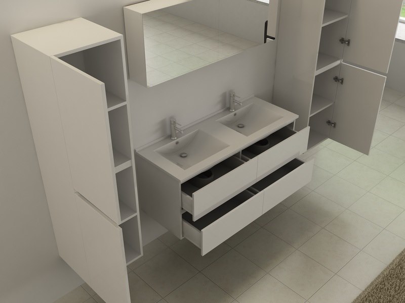 Merk: Vonato Product: Badkamermeubel Kleur: hoogglans wit Materiaal: 18 mm MFC Conditie: nieuw Specificaties: Type: HAVIKLUXWM-2-120. Model: 2-persoons badkamermeubel 120 cm - hoogglans wit met witte wasbak. Afmeting: 2-persoons set: 1 * Wastafelmeubel - 1200x455x520mm, 1 * Dubbele wasbak – 1200x460x160mm (rand 2 cm), 2 * Zijkasten - 1500x350x350mm, 1 * Spiegelkast - 1200x450x180mm. Voorzien van: Kranen inclusief pop-up drain – 4 lades - Softclose systeem op deurtjes en lades - giethars wasbakken – LED verlichting boven de spiegel – Spiegelkast met 3 deurtjes en 2 planken - Voorgemonteerde zijkasten en wastafelmeubel.