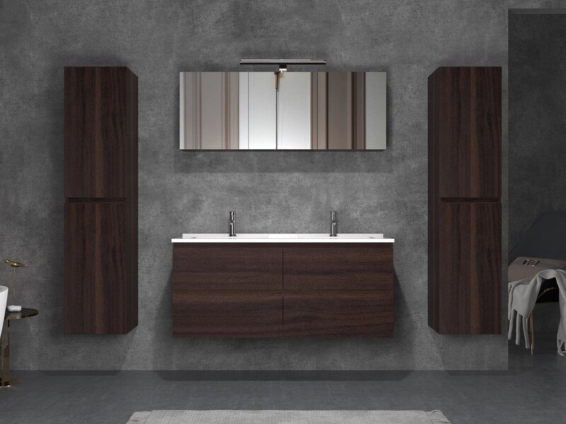 Merk: Vonato Product: Badkamermeubel Kleur: donker hout decor Materiaal: 18 mm MFC Conditie: nieuw Specificaties: Type: HAVIKLUXWM-2-120-H084. Model: 2-persoons badkamermeubel 120 cm - donker hout decor met witte wasbak. Afmeting: 2-persoons set: 1 * Wastafelmeubel - 1200x455x520mm, 1 * Dubbele wasbak – 1200x460x160mm (rand 2 cm), 2 * Zijkasten - 1500x350x350mm, 1 * Spiegelkast - 1200x450x180mm. Voorzien van: Kranen inclusief pop-up drain – 4 lades - Softclose systeem op deurtjes en lades - giethars wasbakken – LED verlichting boven de spiegel – Spiegelkast met 3 deurtjes en 2 planken - Voorgemonteerde zijkasten en wastafelmeubel.
