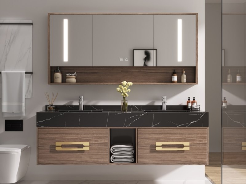 Merk: Vonato Product: Badkamermeubel Kleur: donker hout decor Materiaal: Meubel: Multiplex met melamine, Wasbak: Marmer Conditie: nieuw Specificaties: Type: MBY-315. Afmeting: 2-persoons set: 1 * Wastafelmeubel - 1500x550x550mm, 1 * Spiegel - ca. 1500x700mm. Voorzien van: Softclose lade systeem: 4 lades - Kranen inclusief pop-up drain - Spiegel met touchscreen LED-verlichting en anti-fog technologie - Voorgemonteerd wastafelmeubel.
