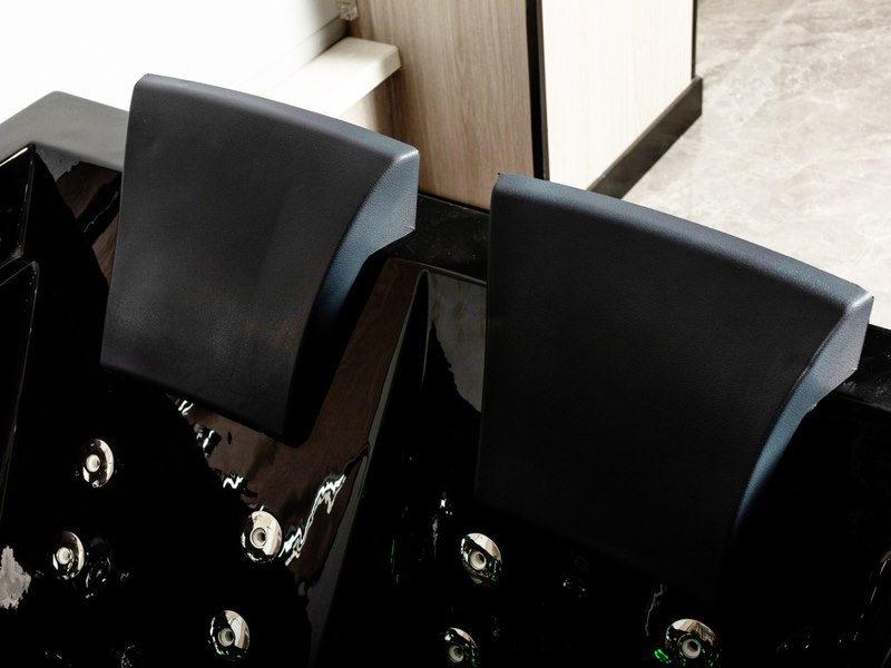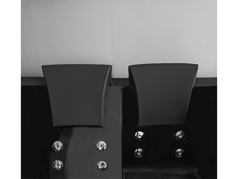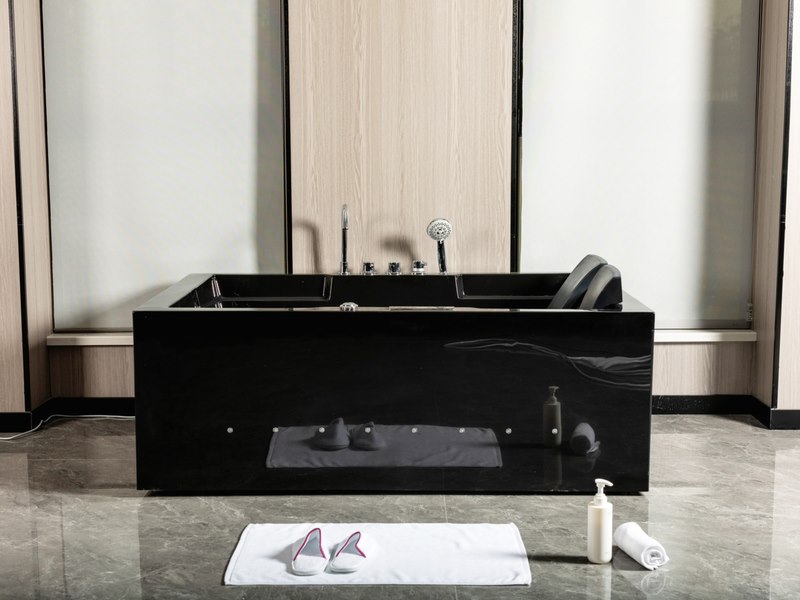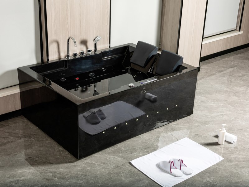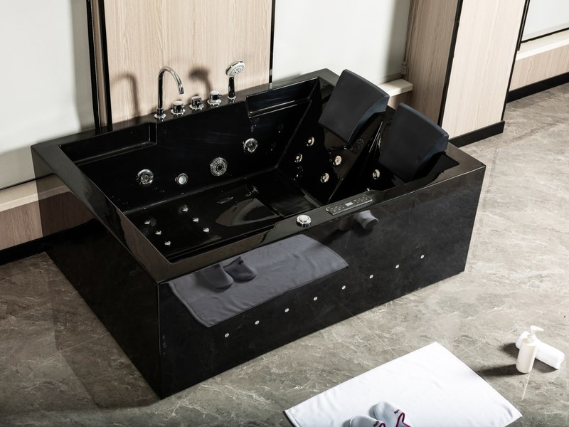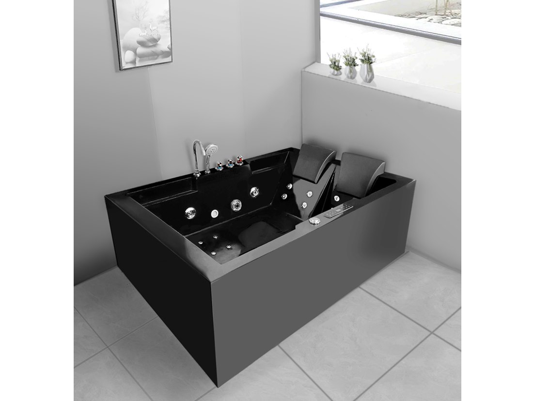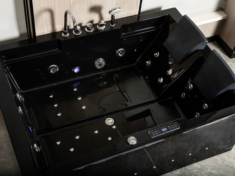 Merk: Vonato Product: Massagebad Kleur: zwart Materiaal: RVS frame en acryl bad Conditie: nieuw Specificaties: Type: LF12171B. Model: Rechtse opstelling. Afmeting: 1700x1200x650mm. Kleur: Zwart. Waterjets:8 Whirlpool jets rug - 6 extra whirlpool jets - 16 Airbubble jets. Voorzien van: Thermostatische waterkranen - Handdouche - 2 kussens - Bluetooth - Bedieningspaneel D4 FM - Heater - Ozone desinfectie - Overloop - Afvoer - chroom kleurige kraan en knoppen - gekleurde onderwaterverlichting.