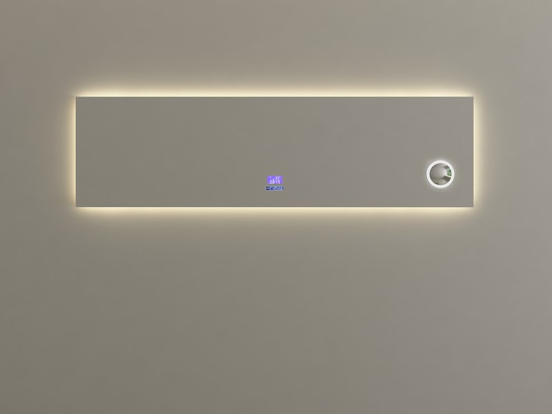 Merk: Vonato Product: Spiegel Kleur: led verlichting in 3 kleuren; geel, blauw en wit Conditie: nieuw Specificaties: Type: RALM-180 Voorzien van: Touch bediening via digitaal display LED verlichting in 3 kleuren, dimbaar Bluetooth & speakers Digitale klok Digitale temperatuurmeter 220 volt aansluiting Anti-fog technologie door verwarming in de spiegel Vergrootglas (vergroot 3x) in de spiegel Ø10 cm Kopervrije spiegel 1,5mm explosieveilige laag aan de achterkant