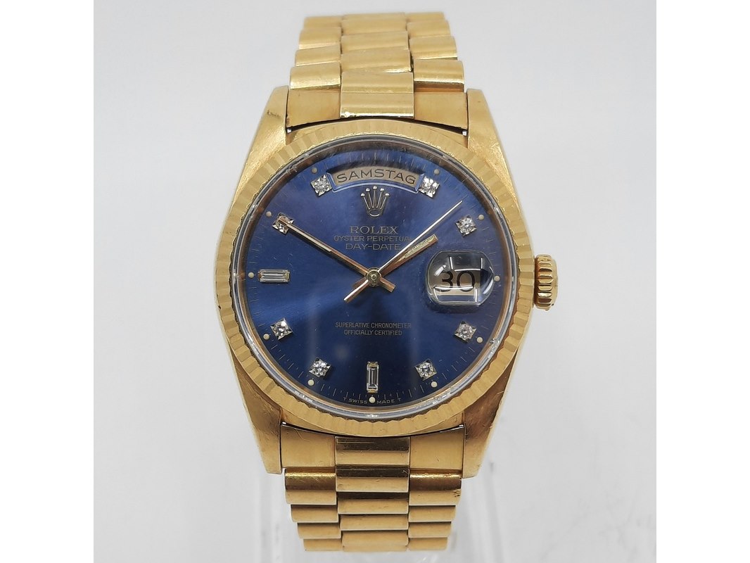 Merk: Rolex Product: Heren polshorloge Conditie: gebruikt Specificaties: Een geelgouden heren polshorloge, Rolex Day-Date. Met blauwe wijzerplaat en band met vouwsluiting. Geen doos en geen certificaat.