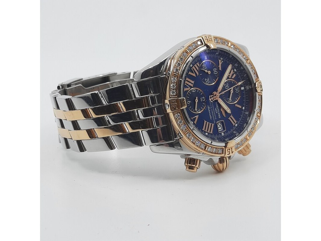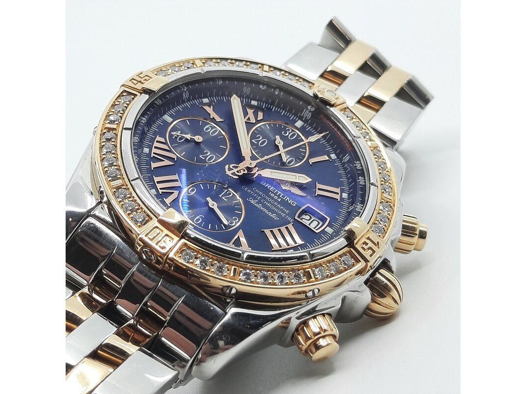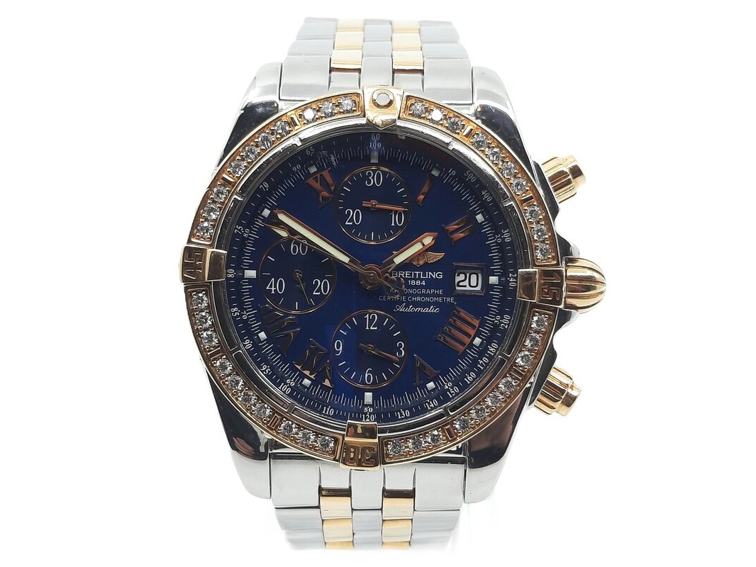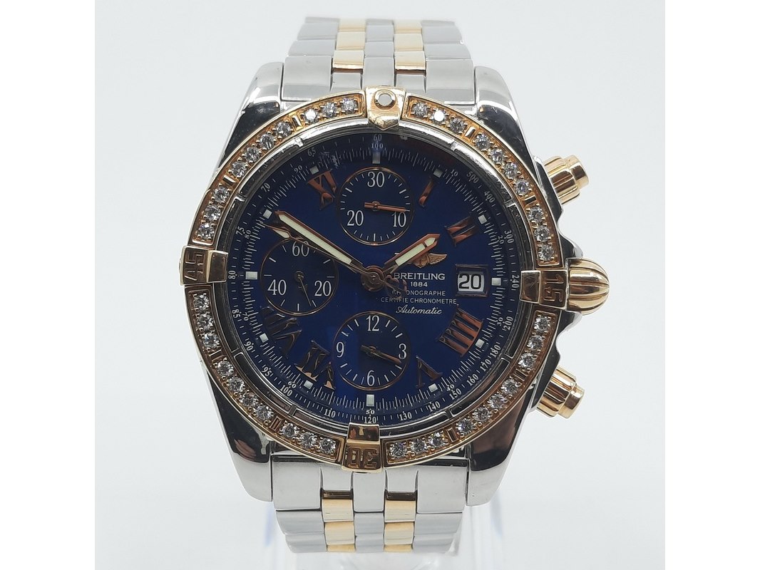 Merk: Breitling Product: Heren polshorloge Conditie: gebruikt Specificaties: Een staal met geelgouden heren polshorloge, Breitling Chronomat Evolution C13356. Met blauwe wijzerplaat en staal met geelgouden band. Geen doos en geen certificaat.