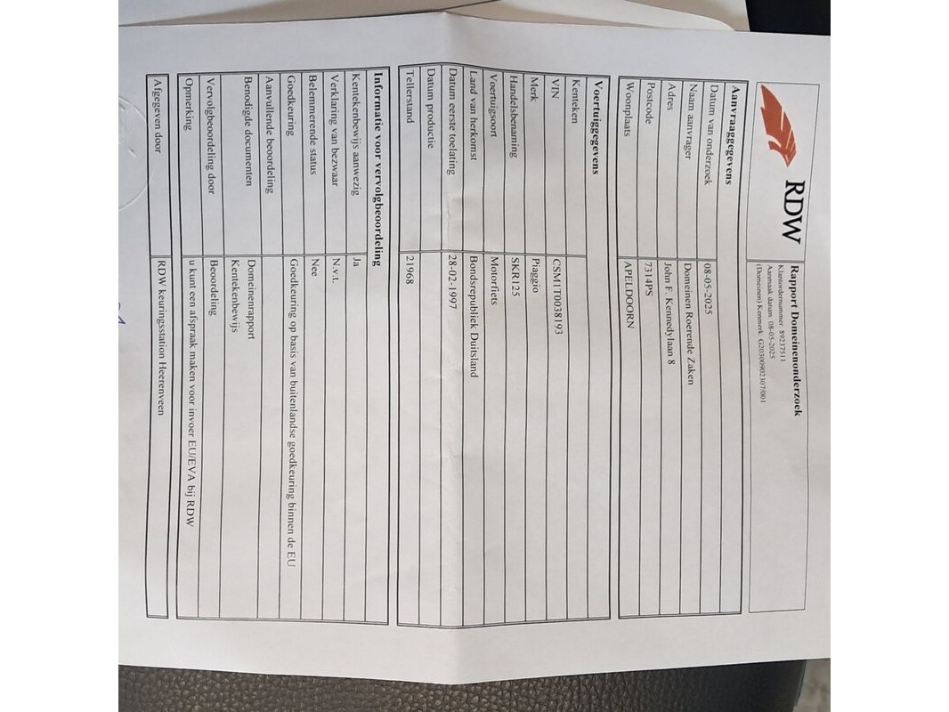 Merk: Piaggio Product: Motorscooter Conditie: gebruikt Specificaties: Kenteken: Niet geregistreerd Eerste toelating nationaal: Niet geregistreerd Brandstof: Benzine Afgelezen tellerstand: 21.968 Aantal sleutels: VIN: CSM1T003893 Start: nee Opties ed Bagagerek Waargenomen gebreken Diverse gebruikssporen rondom Buddyseat stuk Goedkeuring op basis van buitenlandse goedkeuring binnen de EU