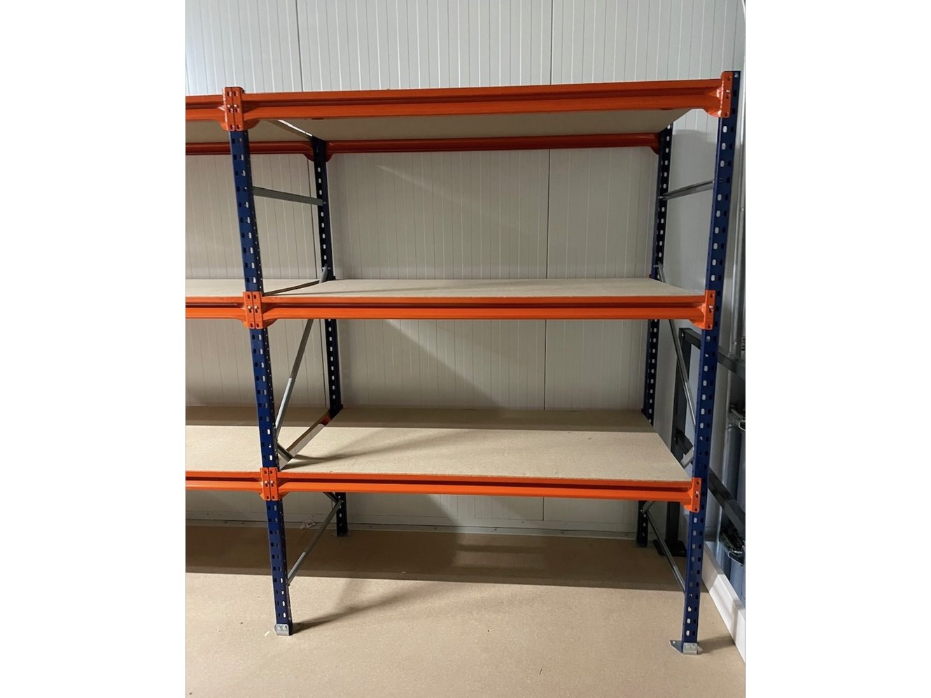 Product: Grootvakstelling oranje/blauw totaal 12 meter Conditie: gebruikt Specificaties: Bestaande uit 8 grootvakstellingen in de kleuren oranje/blauw, met een totale lengte van circa 12 meter. Elke stelling is compleet uitgevoerd met liggers en planken. Afmetingen per stelling: Hoogte ca. 2,00 meter Diepte ca. 0,60 meter De stellingen zijn gedemonteerd en liggen opgeslagen. Bij deze kavel zijn enkel de stellingen inbegrepen. De kavelbeschrijving is bepalend. Producten en materialen die op de achtergrond van de foto’s zichtbaar zijn, maken geen deel uit van de kavel.