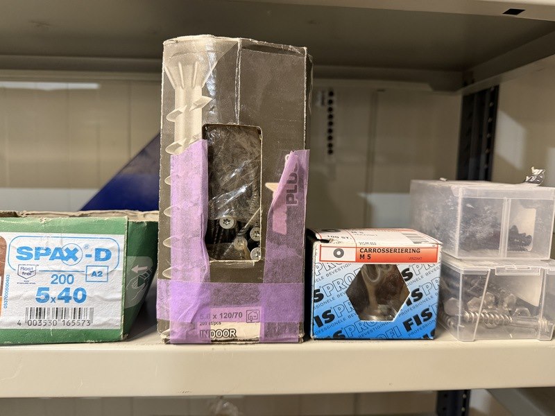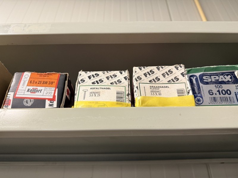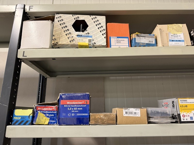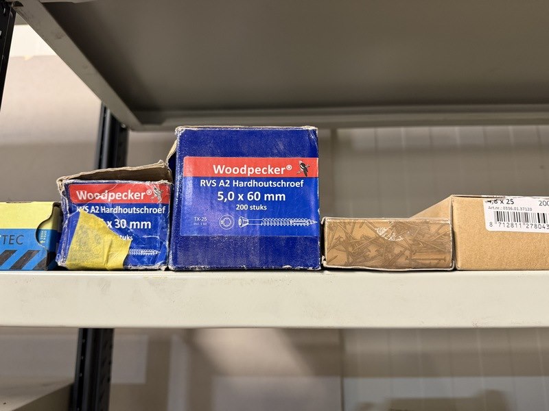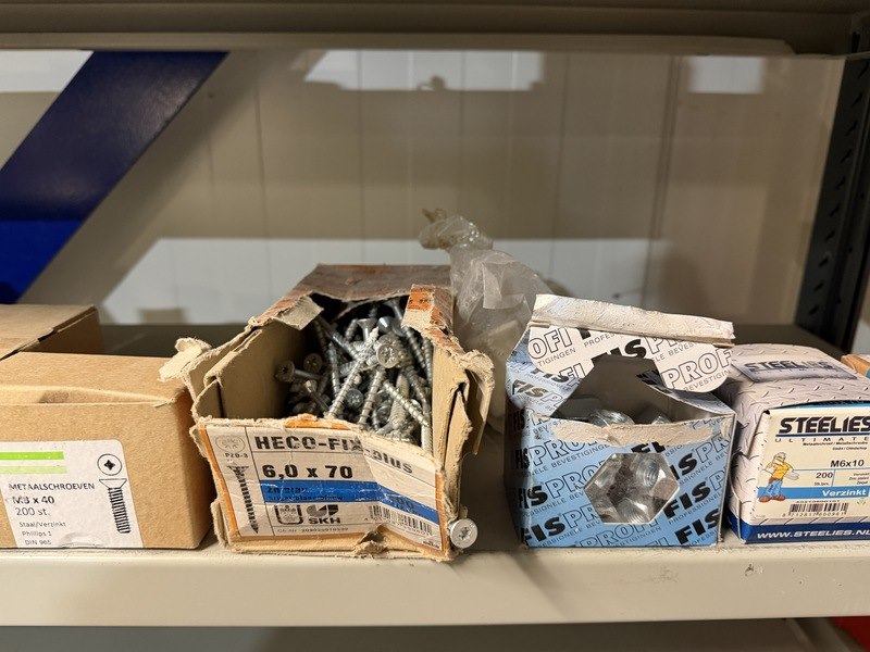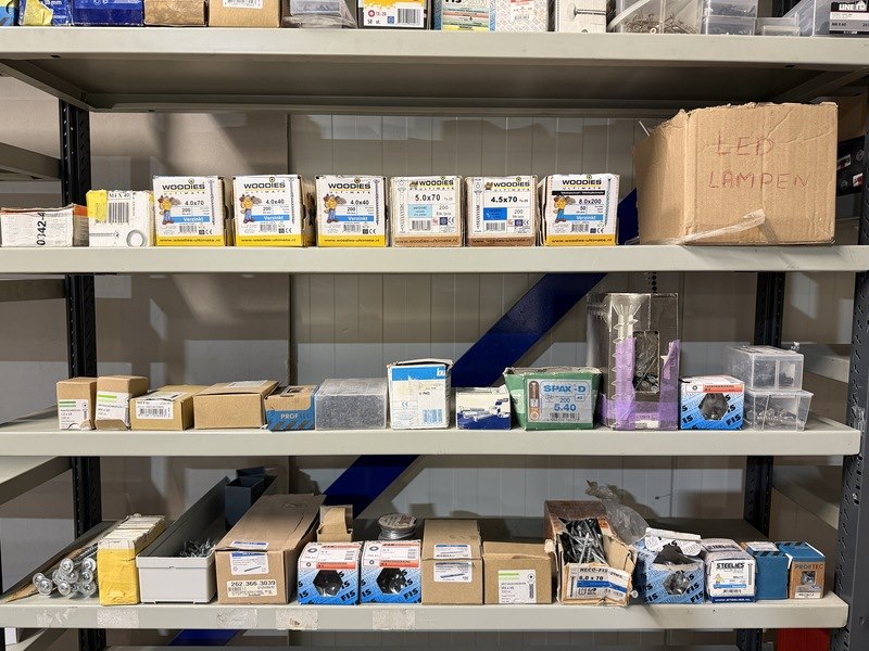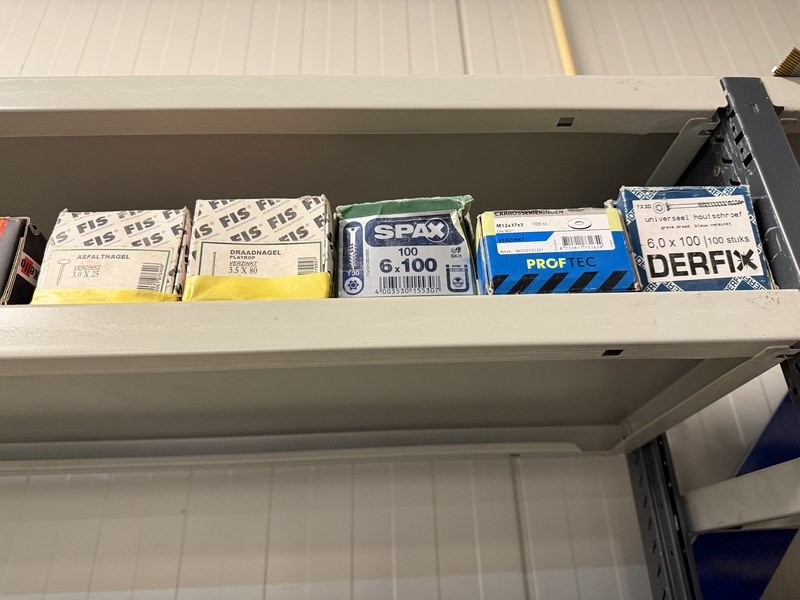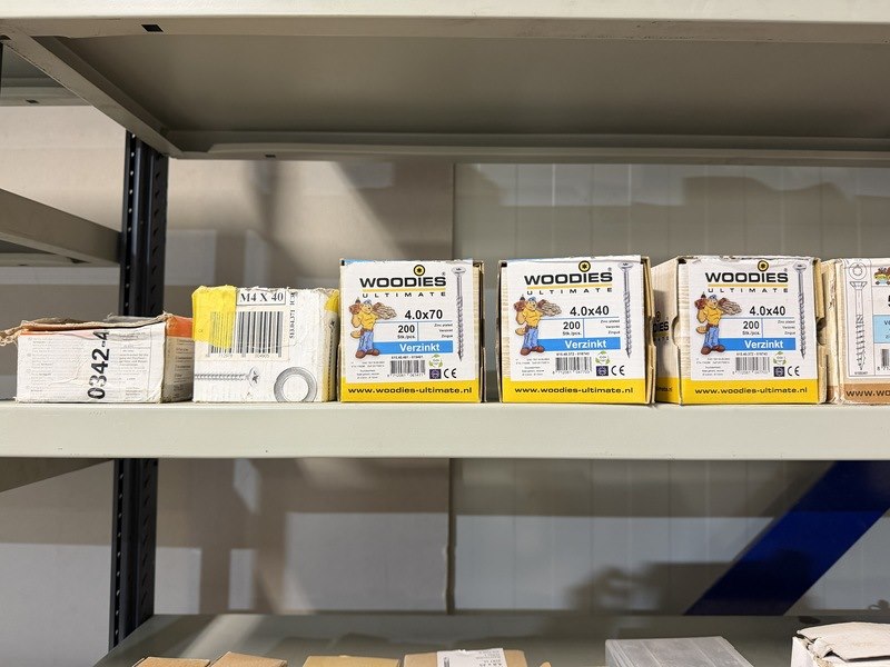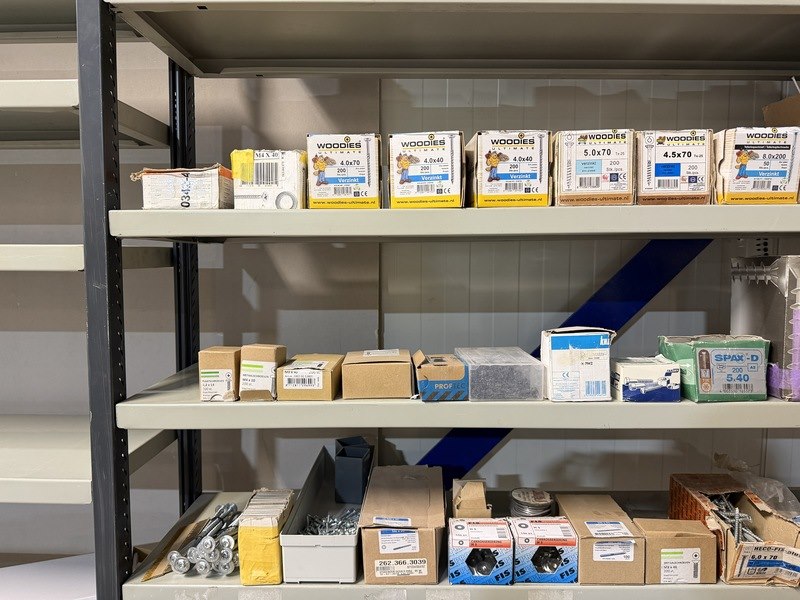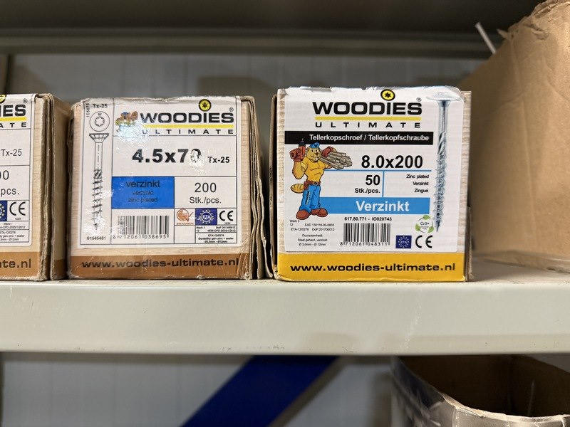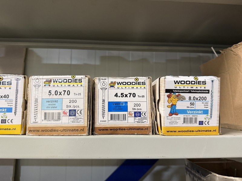 Merk: w.o. Woodies, SPAX, FIS, Kelfort Product: Verpakking ijzerwaren w.o. schroeven, spijkers, pluggen Specificaties: Nieuw. Sommige verpakkingen zijn aangebroken.