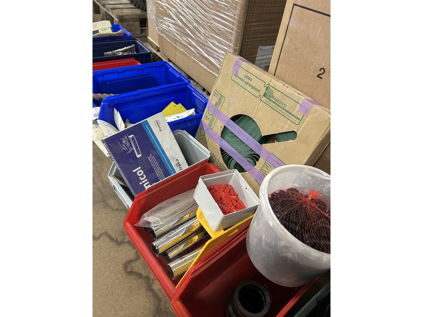 Product: Assortimentsbak met diverse bouwmaterialen Specificaties: Nieuw en gebruikt.
