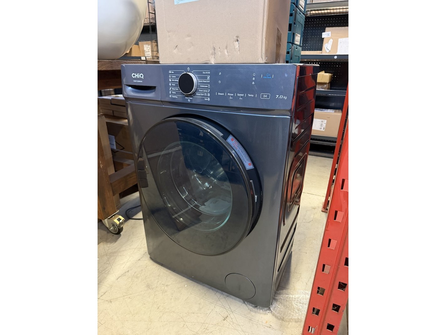 Merk: CHiQ Product: Wasmachine 7 kg AI Smart energieklasse A Afmeting: 600x465x850 mm Specificaties: Demo model.