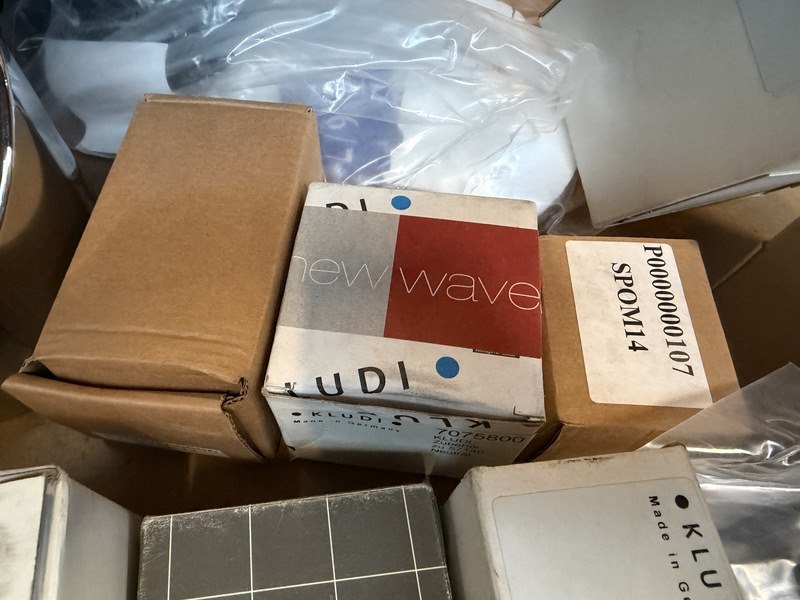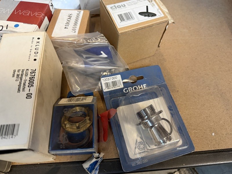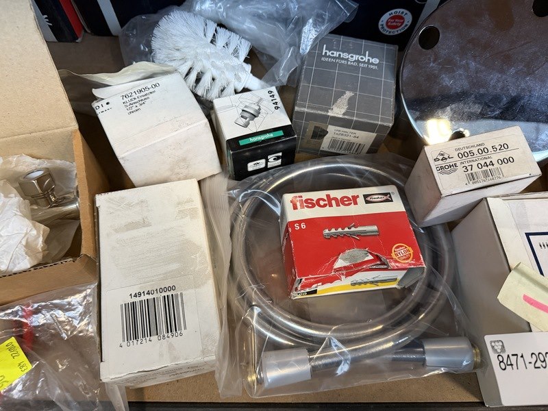 Merk: w.o. clou, Grohe, Hansgrohe, Fischer Product: Partij sanitair/badkamer accessoires en toebehoren Conditie: nieuw Specificaties: Enkele verpakkingen zijn beschadigd. HADEF takels op de achtergrond van de foto's zijn niet bij deze kavel inbegrepen.