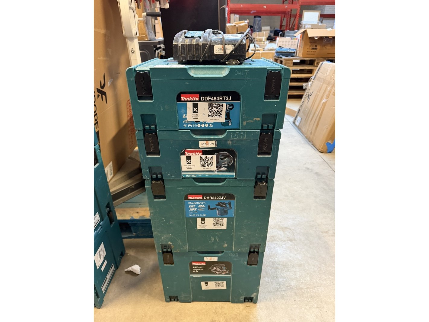 4x bouwgereedschap in koffer, 1x lader makita, ddf484rt3j, djv182zj, dhr242zjv, dhs630zj