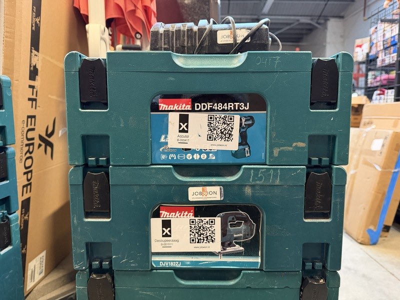 Merk: Makita Product: Bouwgereedschap in koffer, 1x lader Specificaties: DDF484RT3J boor-/schroefmachine, DJV182ZJ decoupeerzaag, DHR242ZJV combihamer, DHS630ZJ cirkelzaag. Zonder accu, met lader.