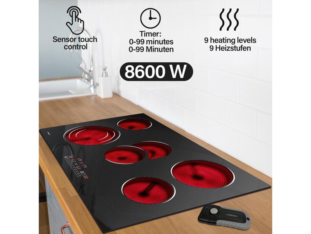 Merk: JAGO Product: Keramische kookplaat met 5 zones Conditie: nieuw Specificaties: 8600W - 9 Vermogensniveaus.