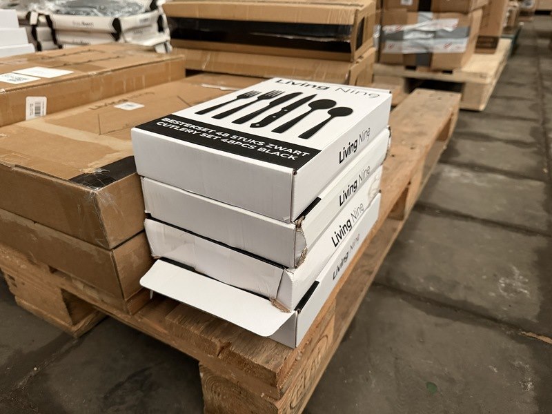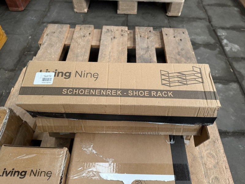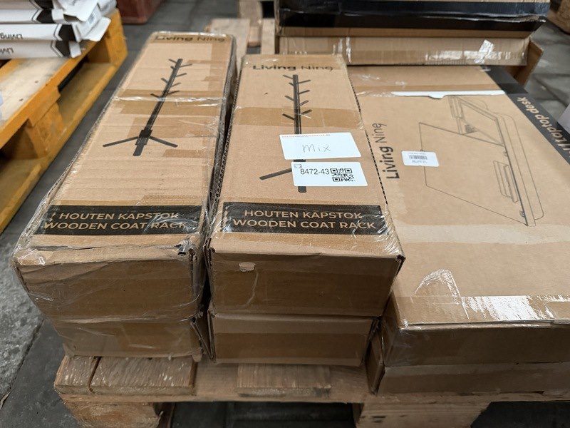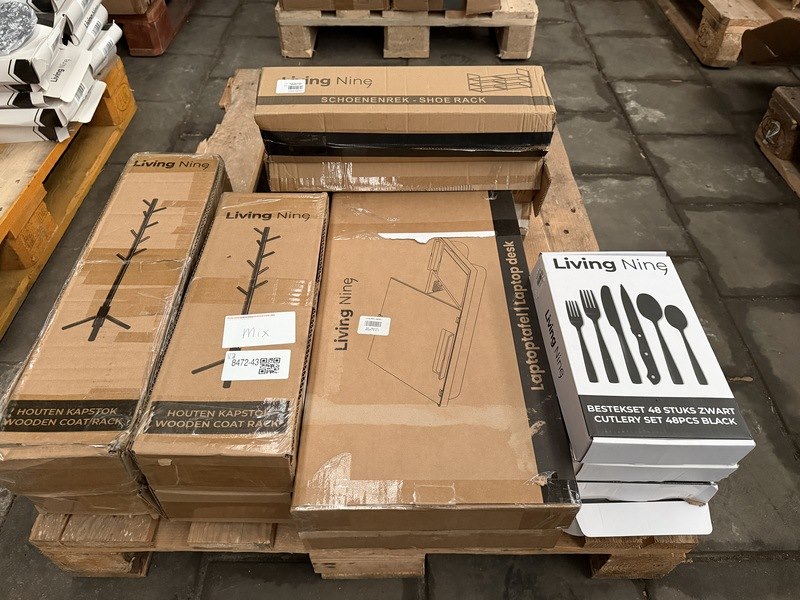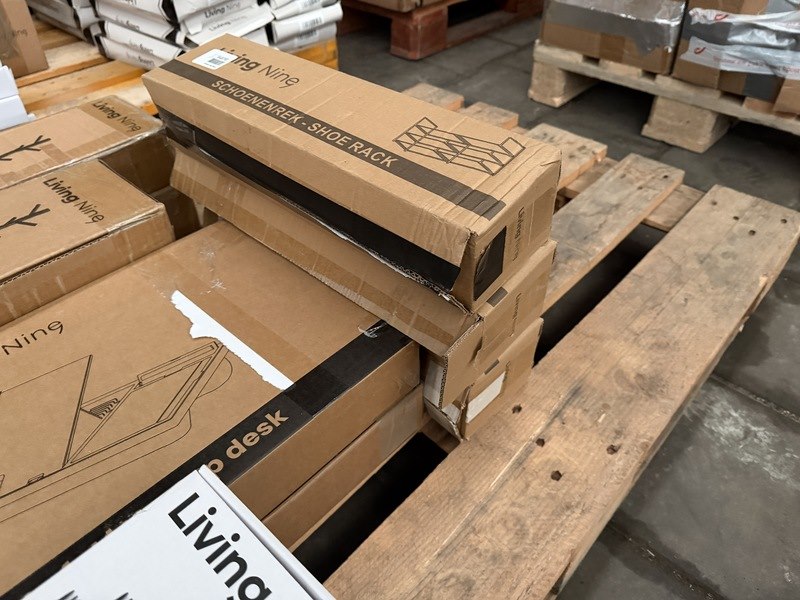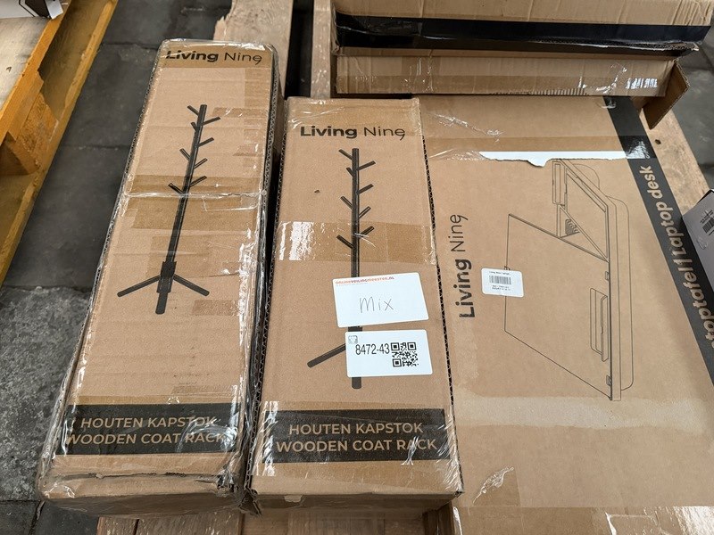 Merk: Living Nine Product: Partij besteksets, laptoptafels en kapstokken Specificaties: Nieuw, showroom modellen en demo modellen. Verpakking beschadigd.