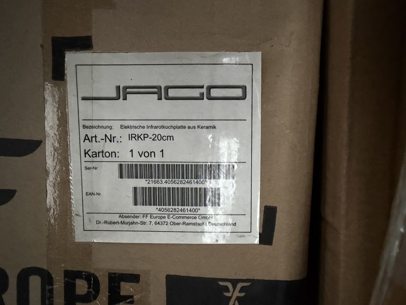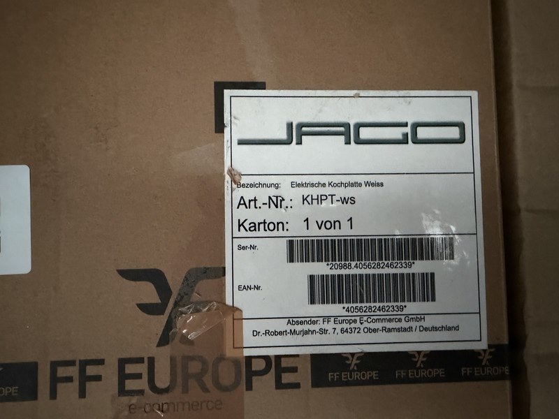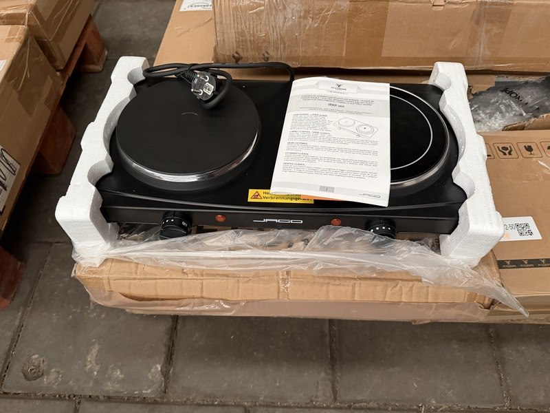 Merk: JAGO Product: Elektrische kookplaat Specificaties: Nieuw, showroom modellen en demo modellen. Verpakking beschadigd.