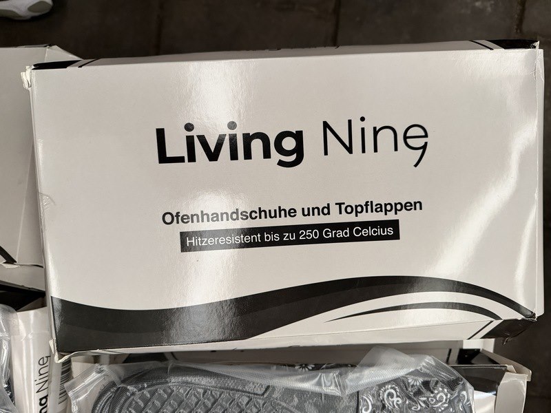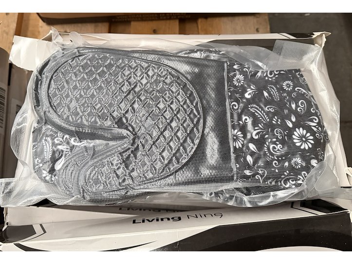 Merk: Living Nine Product: Partij ovenwanten en pannenlappen sets Conditie: nieuw Specificaties: Hittebestendig tot 250 graden.