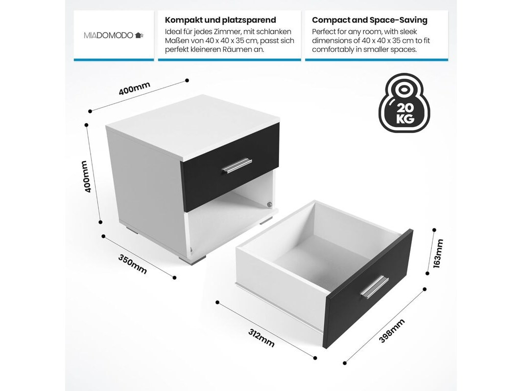 Merk: Miadomodo Product: Set van twee nachtkasten met 2 laden Specificaties: Showroom model. Verpakking beschadigd.