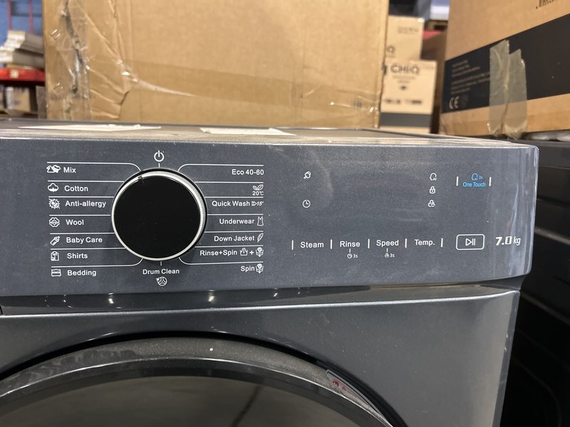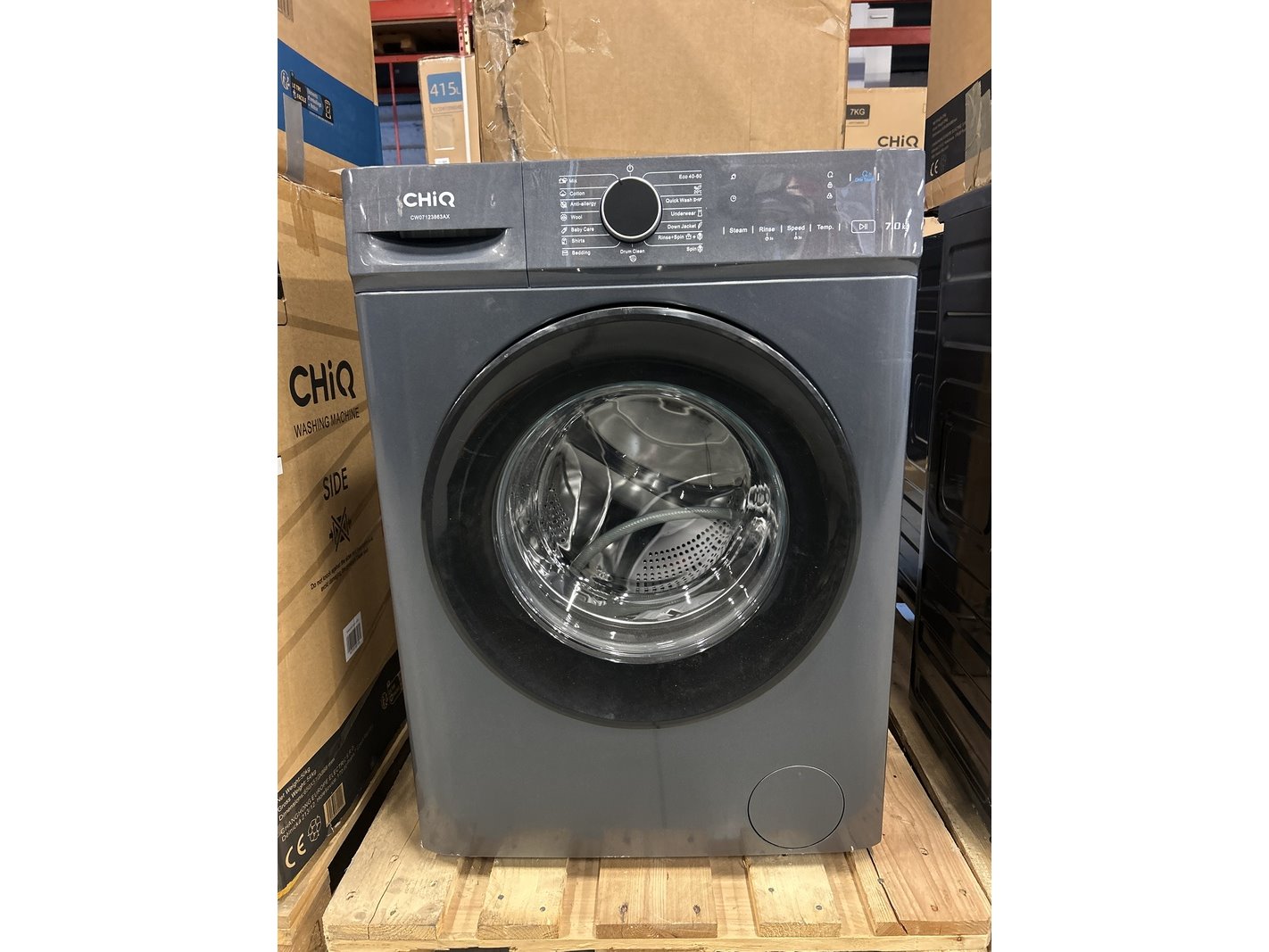 Merk: CHiQ Product: Wasmachine 7 kg AI Smart energieklasse A Afmeting: 600x465x850 mm Specificaties: Demo model.