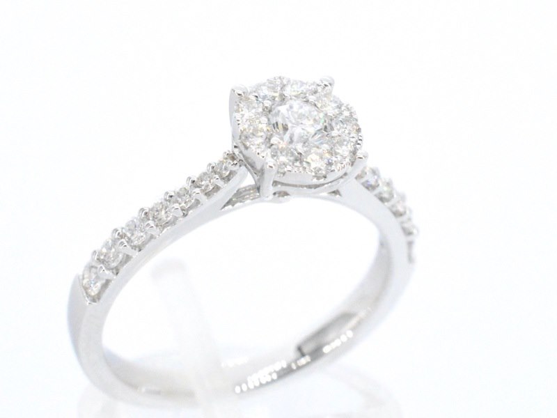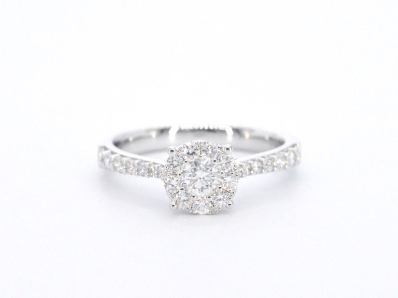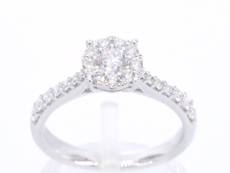 Product: Witgouden entourage ring met briljant geslepen diamanten Specificaties: Diamant: Natuurlijk Slijpvorm: Briljant geslepen Gewicht (carat): 0.75 carat Kleur: F-G Zuiverheid: VS Slijpkwaliteit: Zeer mooi Juweel: Ring Gewicht: 3 gram Ringmaat (op maat gemaakt*): 53 (17 mm) Materiaal: 18K goud (750) Conditie: Nieuw Verpakking: Luxe sieradendoos Toelichting: De kwaliteit is overgenomen van het rapport behorend bij item. De waardebepaling is een beoordeling van een gecertificeerde diamantair, gebaseerd op consumentenprijzen. Consumentenprijs: € 5.985,- *Ringen kunnen als het mogelijk is op maat gemaakt worden.
