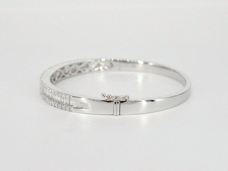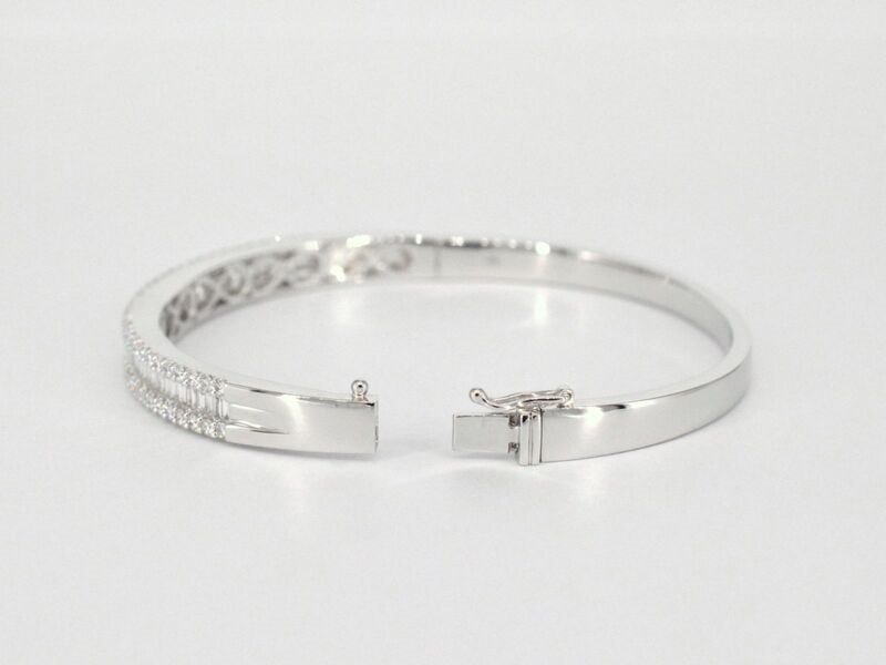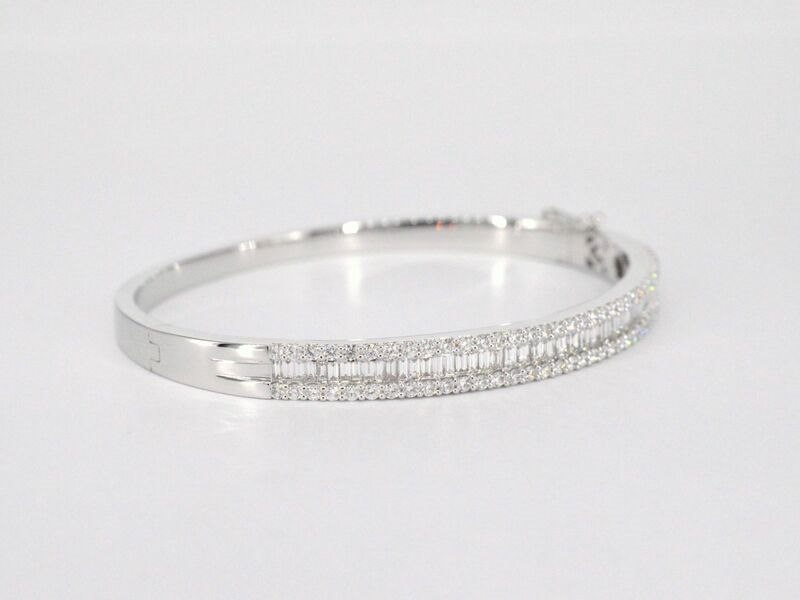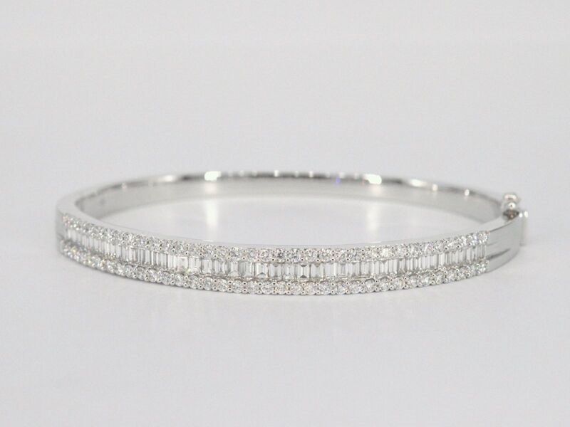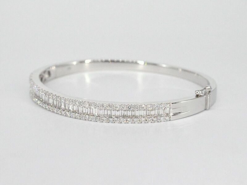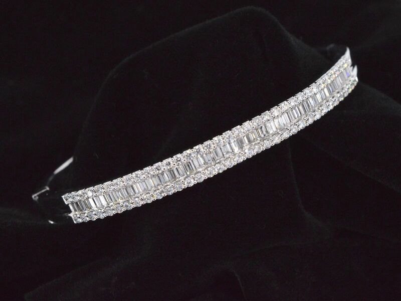 Product: Armband met baguette en briljant geslepen diamanten Specificaties: Aantal: 116 stuks Slijpvorm: Briljant geslepen & baguette geslepen Gewicht (carat): 2.50 carat Kleur: F-G Zuiverheid: VS Slijpkwaliteit: Zeer mooi Juweel: Armband Gewicht: 22 gram Afmetingen/lengte: Diameter: 60 mm Materiaal: 18K goud (750) Conditie: Nieuw Verpakking: Luxe sieradendoos Toelichting: De kwaliteit is overgenomen van het rapport behorend bij item. De waardebepaling is een beoordeling van een gecertificeerde diamantair, gebaseerd op consumentenprijzen. Consumentenprijs: € 21.000,- *Ringen kunnen als het mogelijk is op maat gemaakt worden.