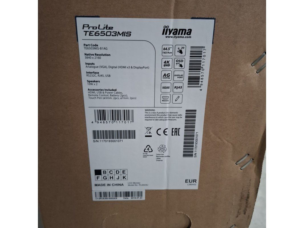 Merk: Iiyama Product: Monitor Afmeting: 64,5'' Conditie: gebruikt Specificaties: Doos is niet geseald.