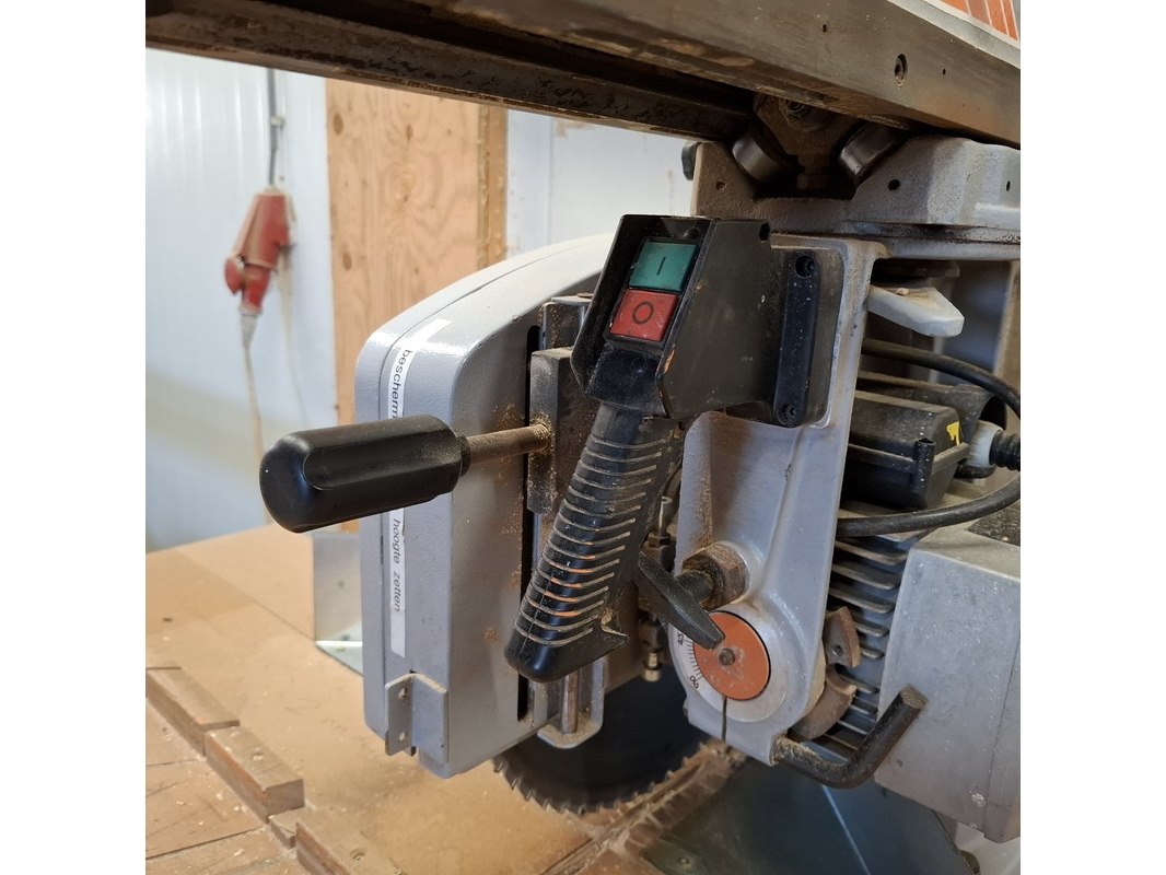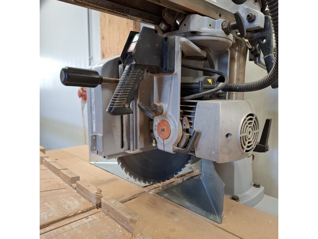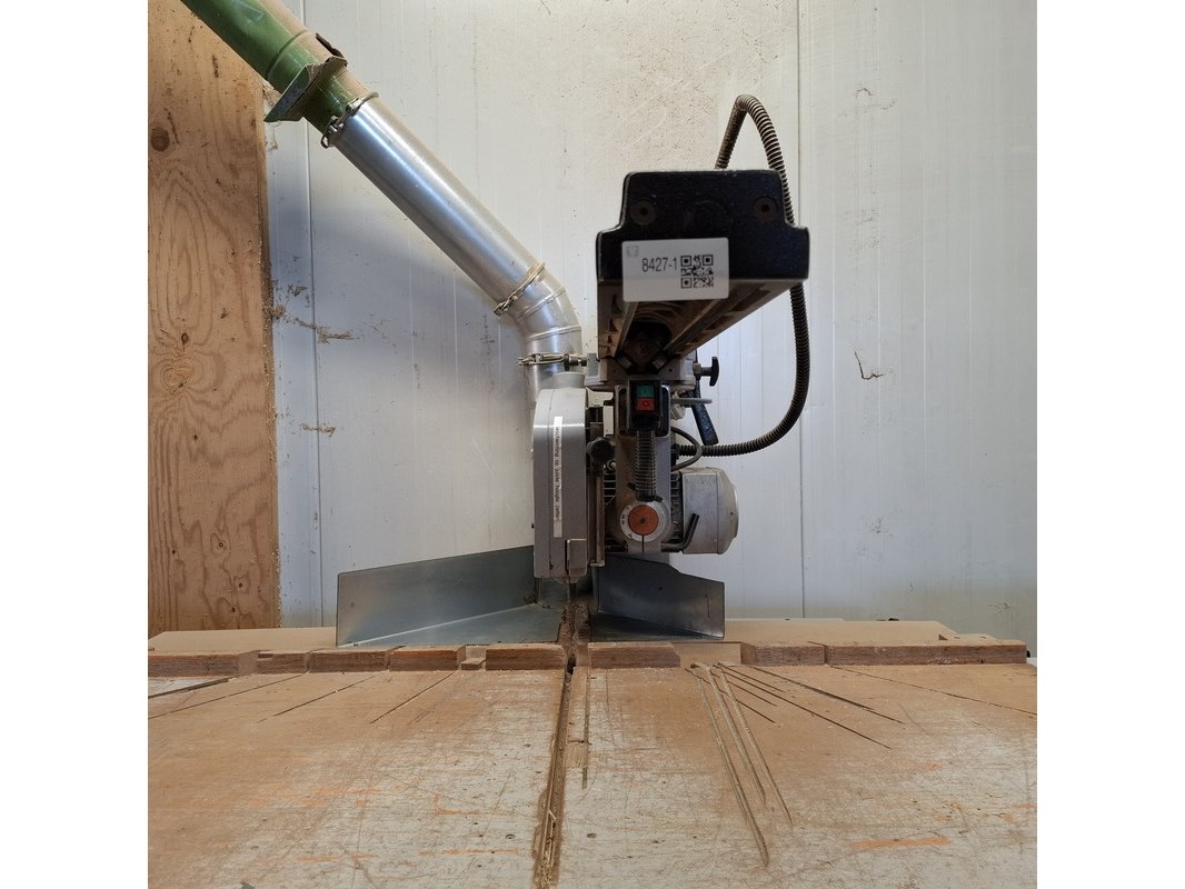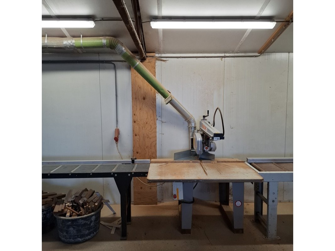 Merk: Maggi Product: Radiaalzaagmachine met aan en afvoerbaan BouwJaar: 2002 Conditie: gebruikt Specificaties: Serienummer: 54310766 380V Afmeting aanvoerbaan lxbxh ca. 435x46x88cm Afmeting zaagtafel met zaag lxbxh ca. 136x132x87/160cm Afmeting afvoerbaan lxbxh ca. 207x51x87cm