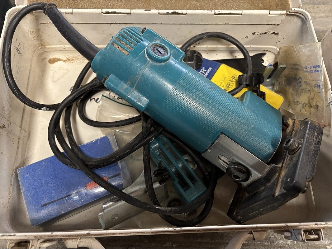 Merk: Makita Product: Elektrische kantenfrees Conditie: gebruikt Specificaties: 230V, 420 Watt, inclusief toebehoren, in koffer.