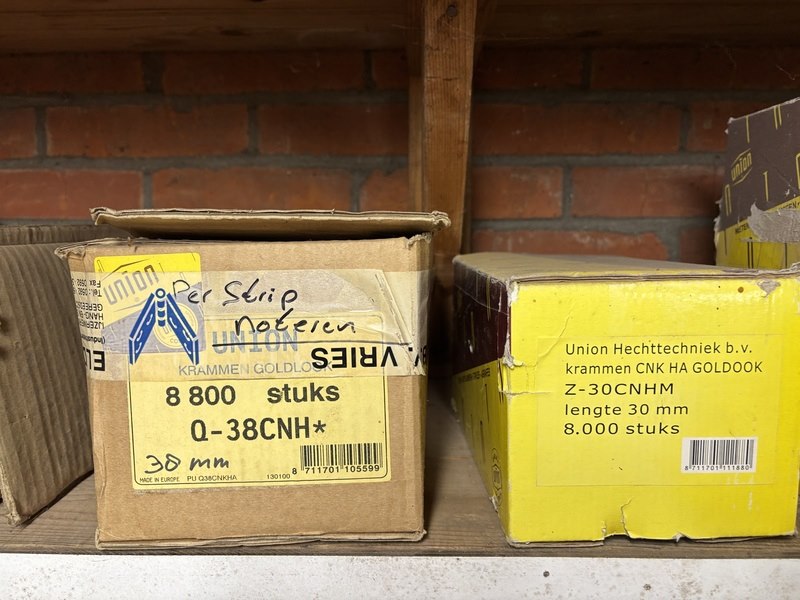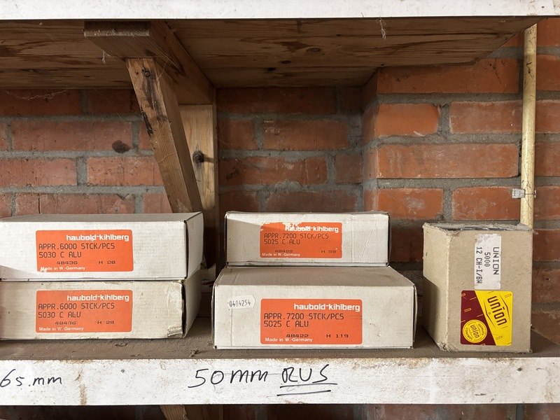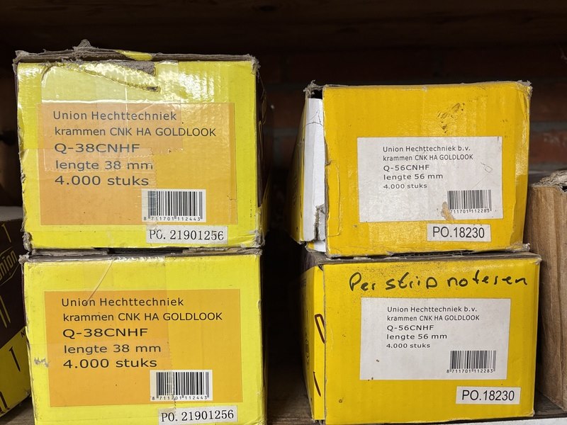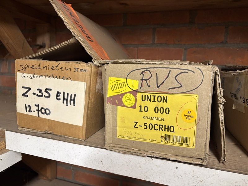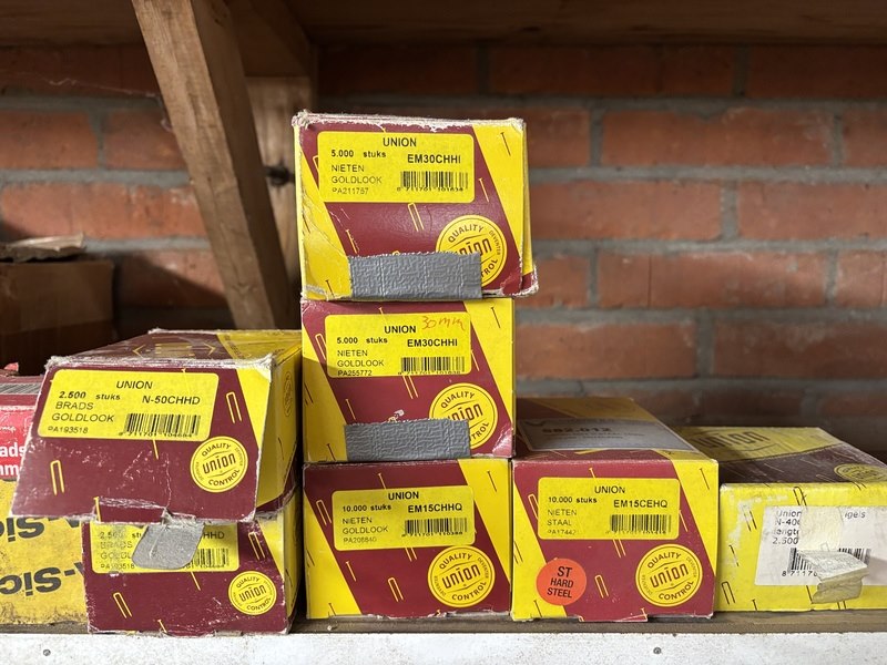 Merk: o.a. Union, Haubold-kihlberg Product: Partij divers ijzerwaar Specificaties: Bestaande uit o.a. Nagels, nieten, krammen, spreidnieten etc. Diverse soorten en maten.