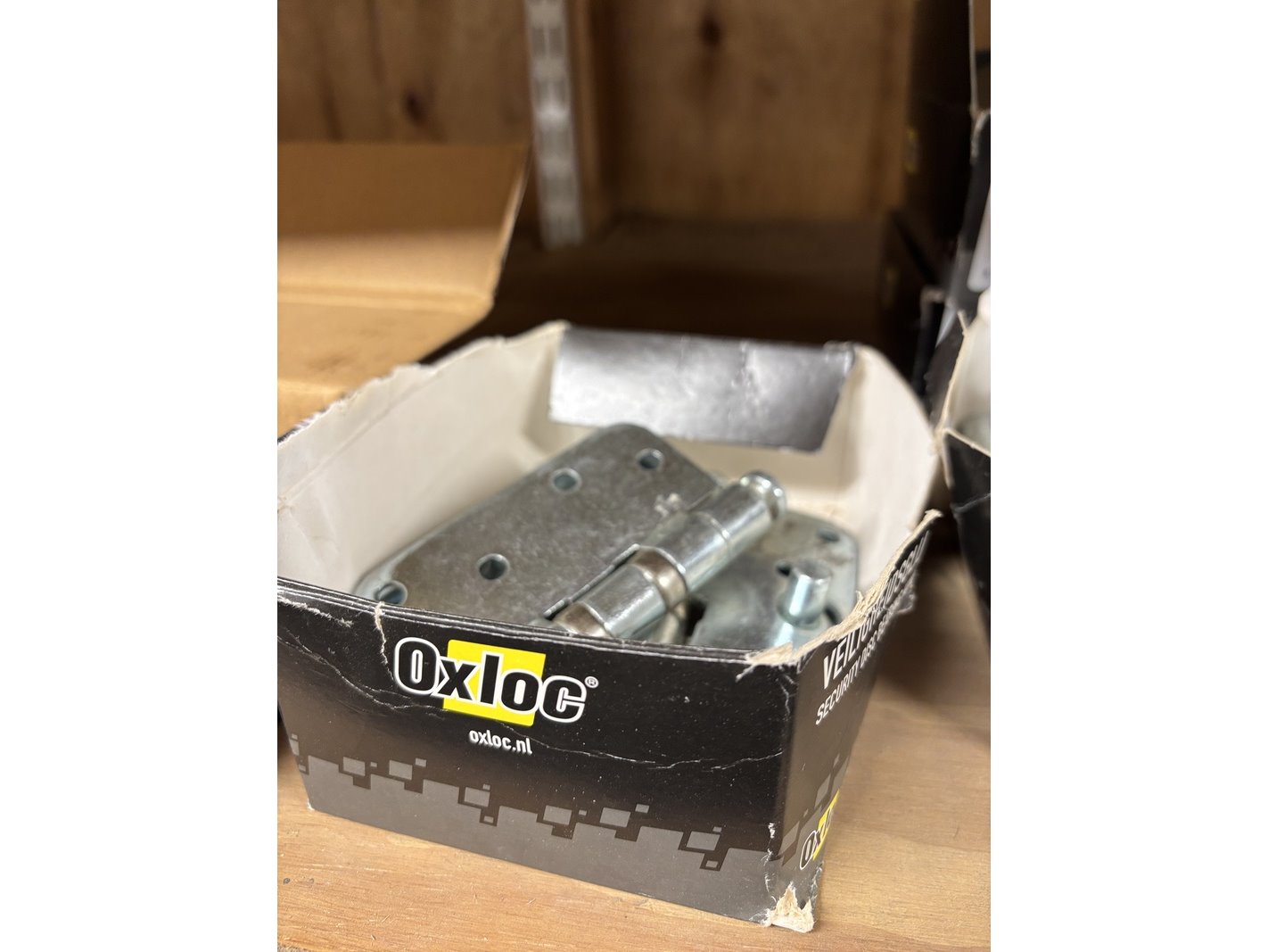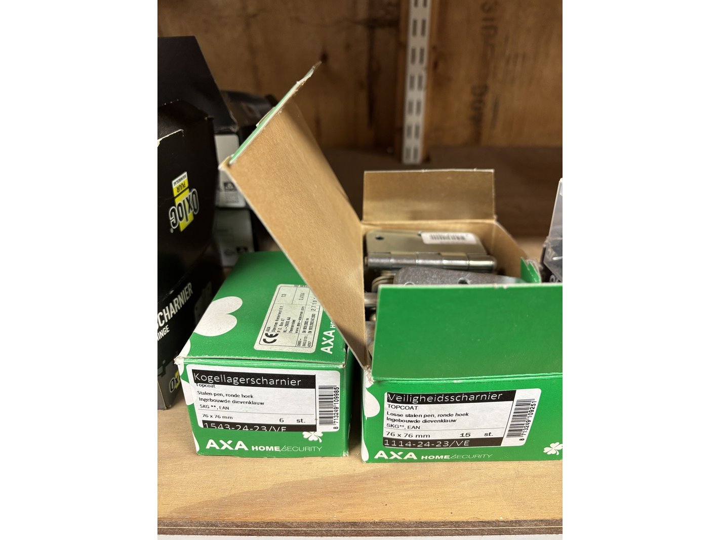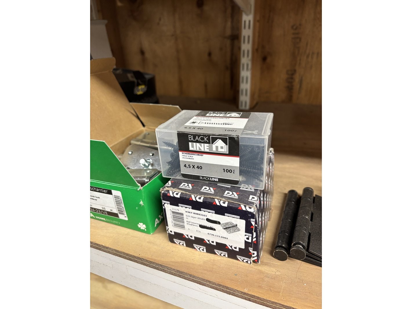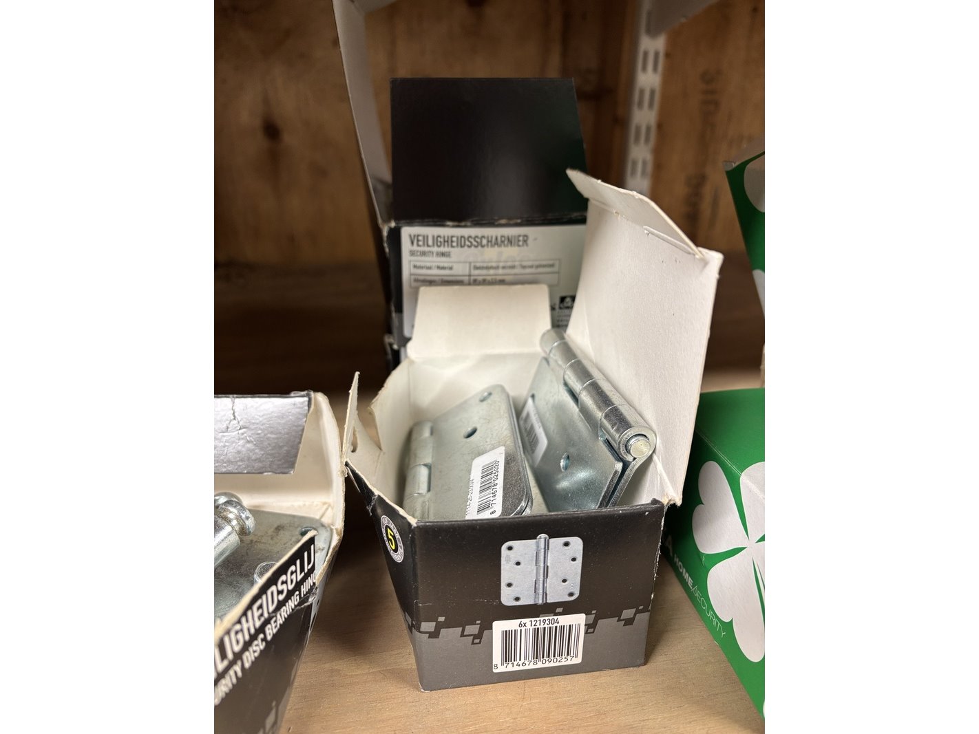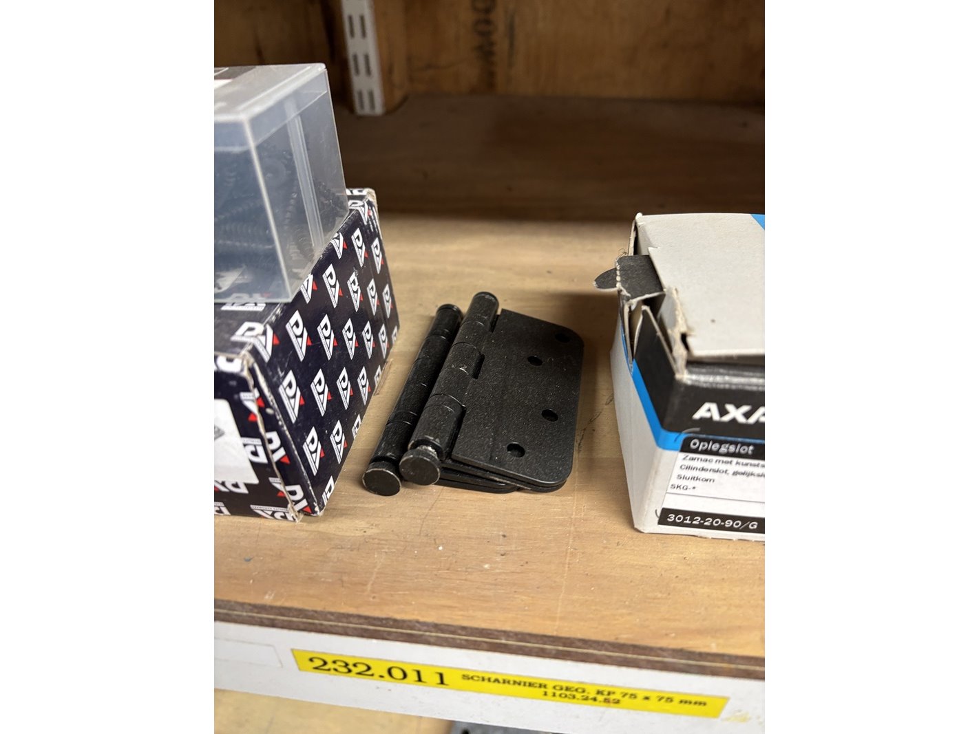 Product: Partij divers scharnieren en toebehoren Specificaties: Bestaande uit o.a. oplegsloten, veiligheidsscharnieren, scharnierschroeven, kogellager scharnieren, inboorpaumelle, raamsluiting, etc.