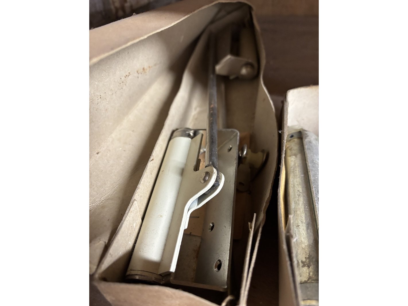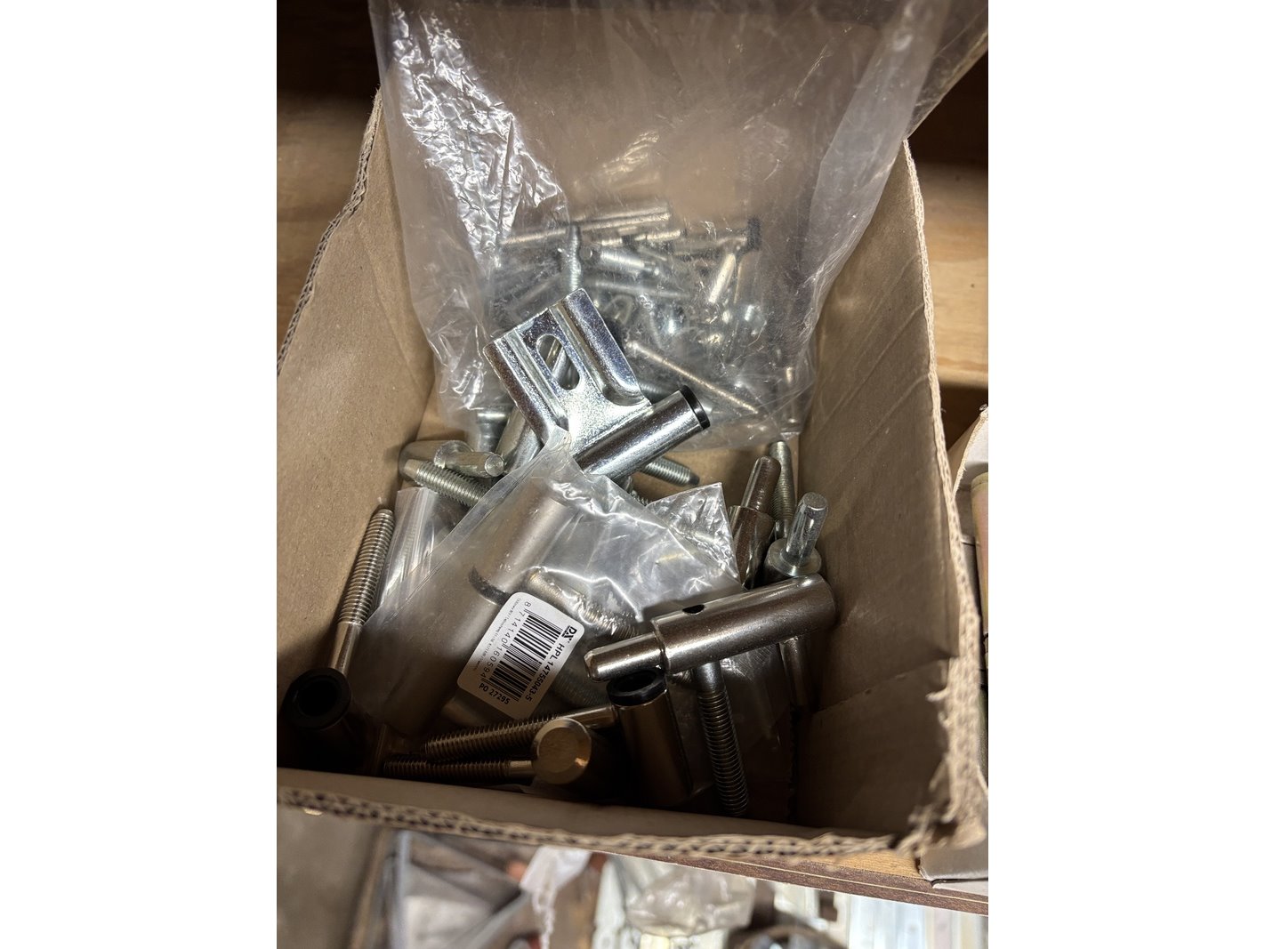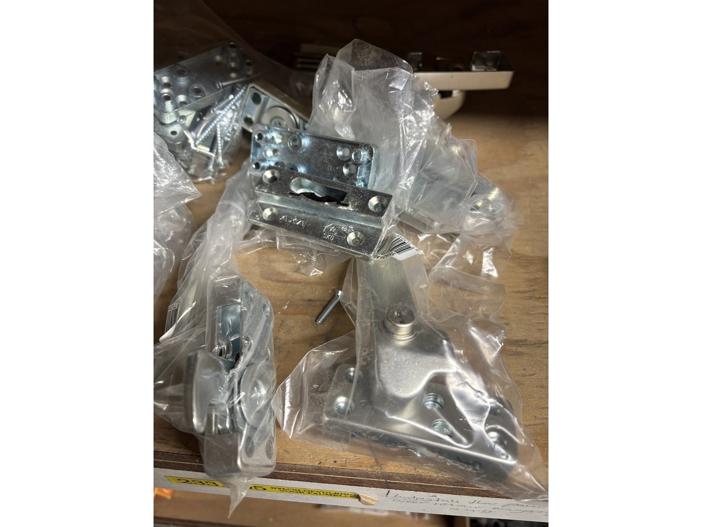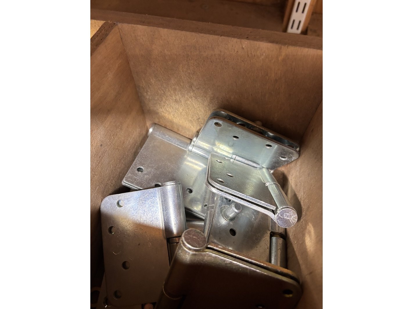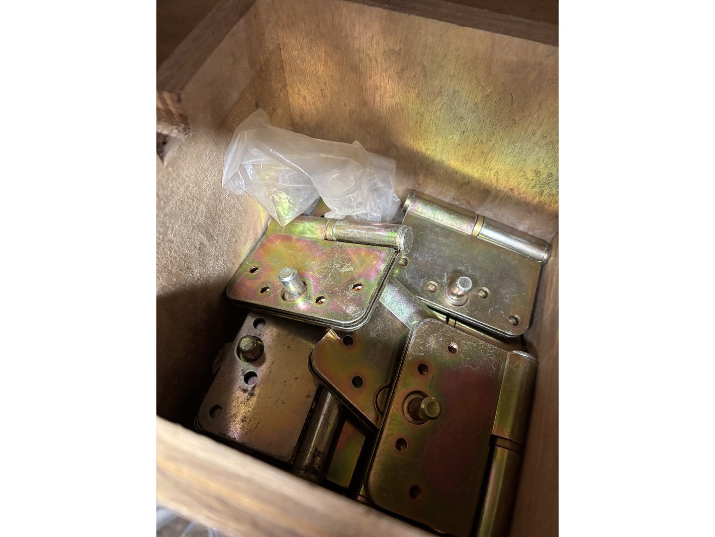 Product: Partij divers scharnieren en toebehoren Specificaties: Bestaande uit o.a. oplegsloten, veiligheidsscharnieren, scharnierschroeven, kogellager scharnieren, inboorpaumelle, raamsluiting, etc.