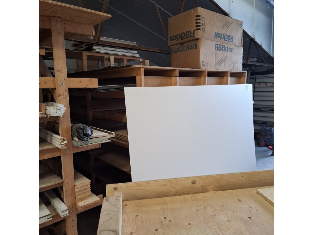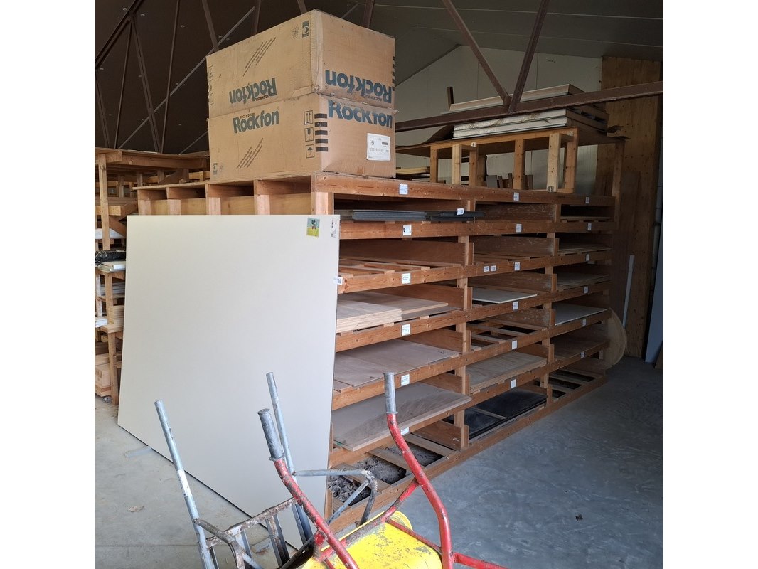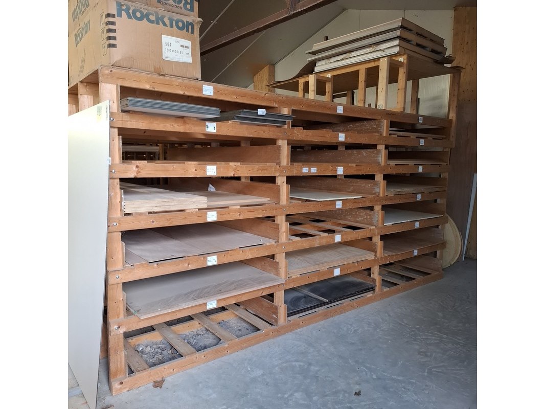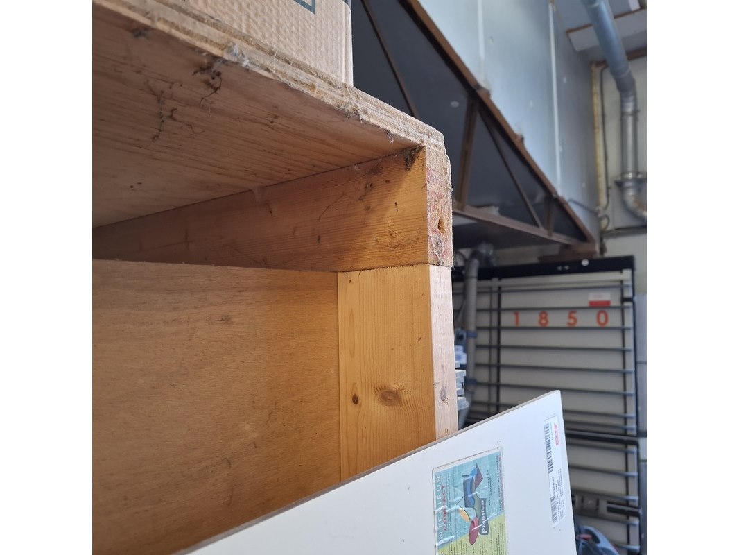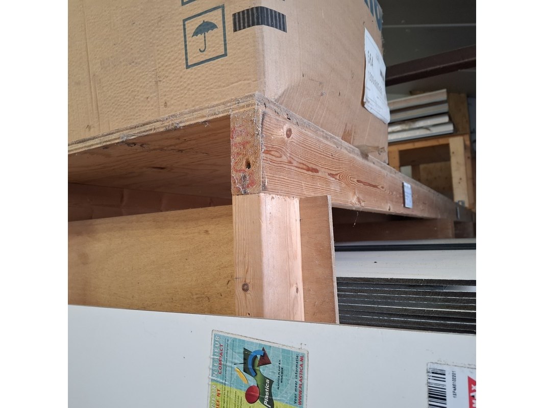 Product: Houten stelling Afmeting: lxbxh ca. 426x250x211/271cm Conditie: gebruikt