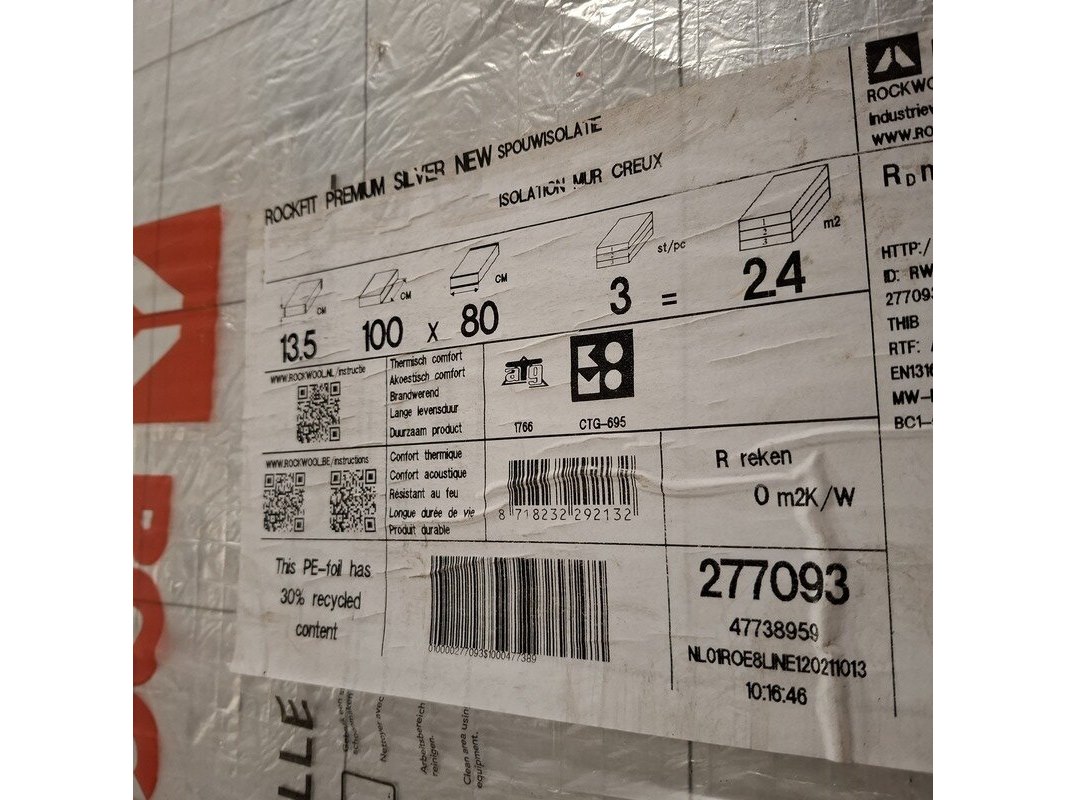 Product: Partij isolatiemateriaal Specificaties: Bestaande uit o.a. 11x plaat Spouwisolatie Rockfit premium silver, 13.5x100x80 cm, Rd 4,05, 8,8 m2. En divers isolatiemateriaal.
