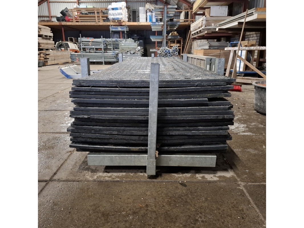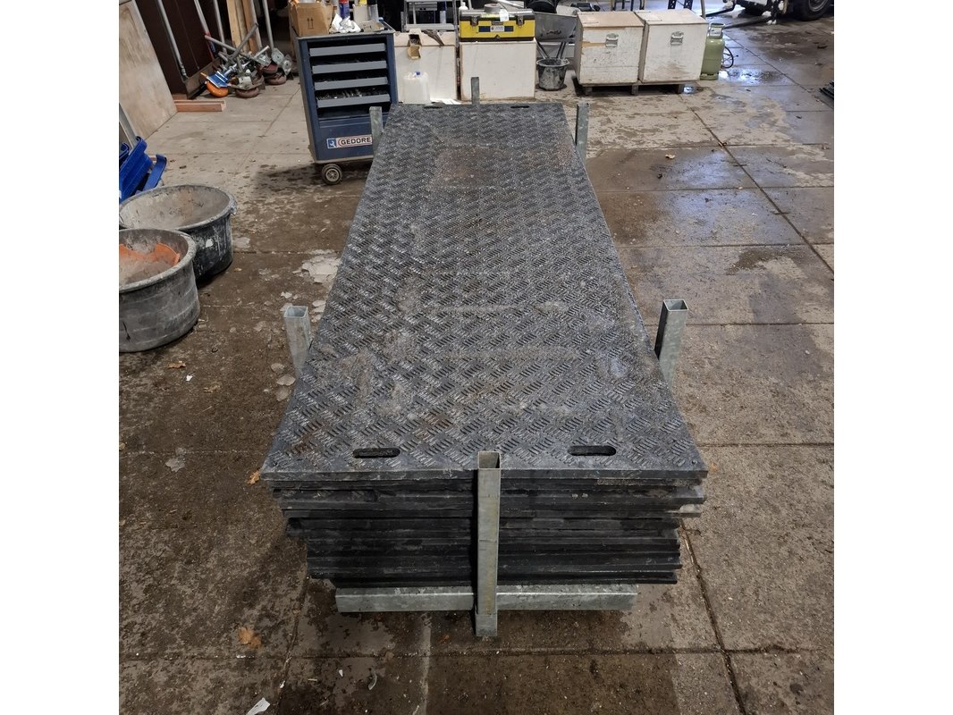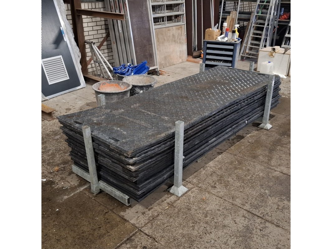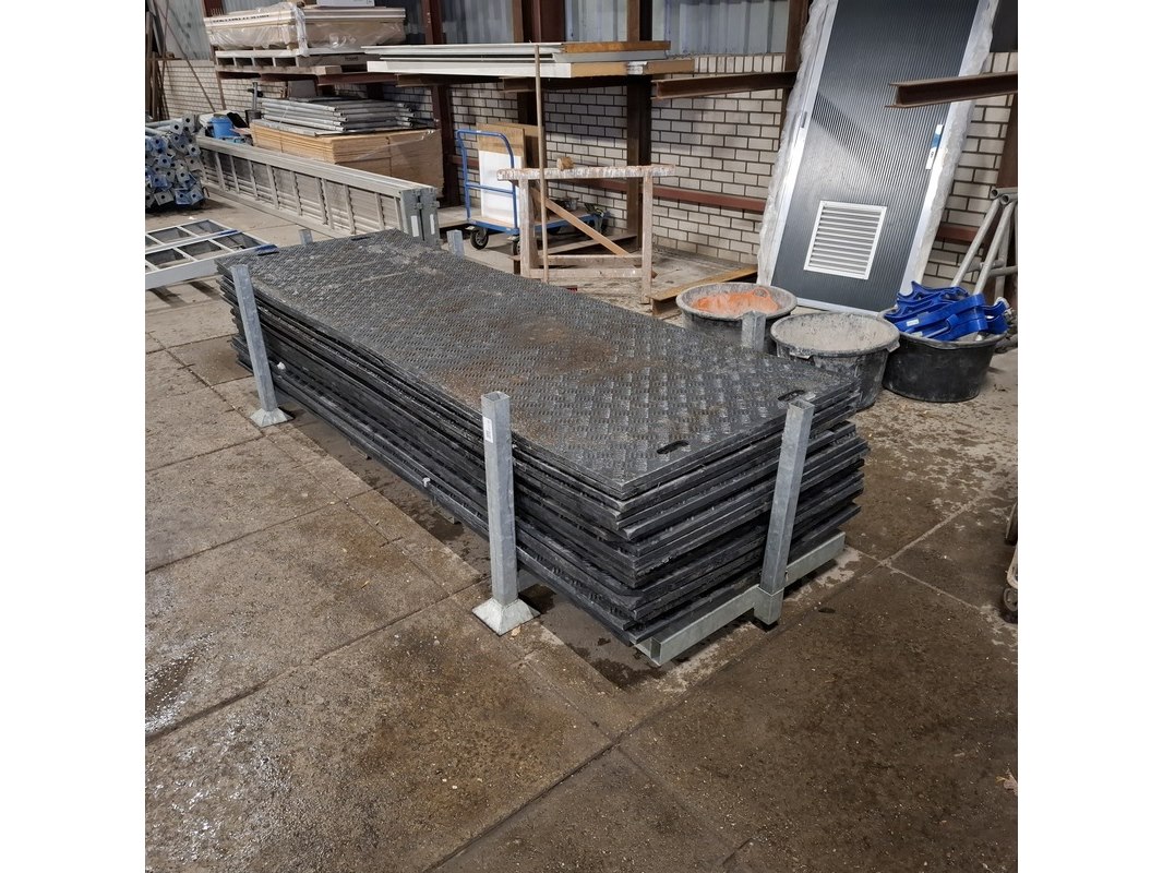 Product: Kunststof rijplaat Afmeting: Ca. 100x300cm Conditie: gebruikt Specificaties: Inclusief bok
