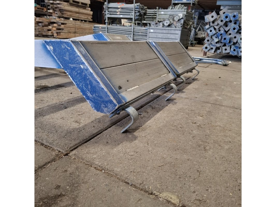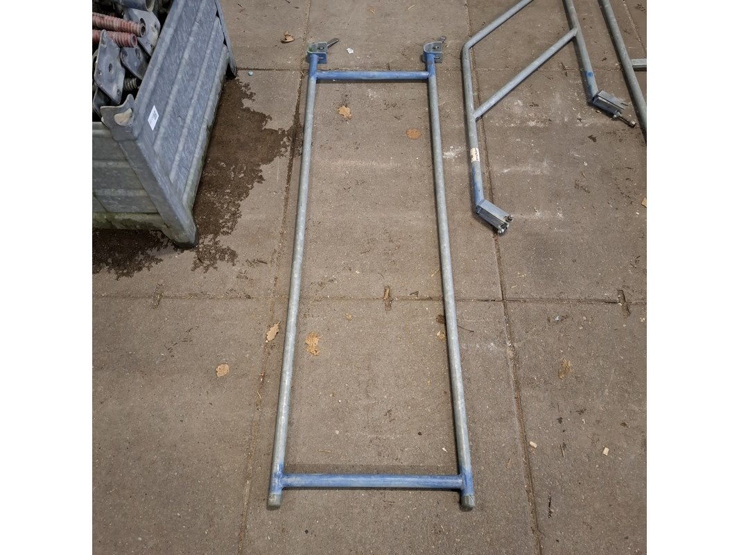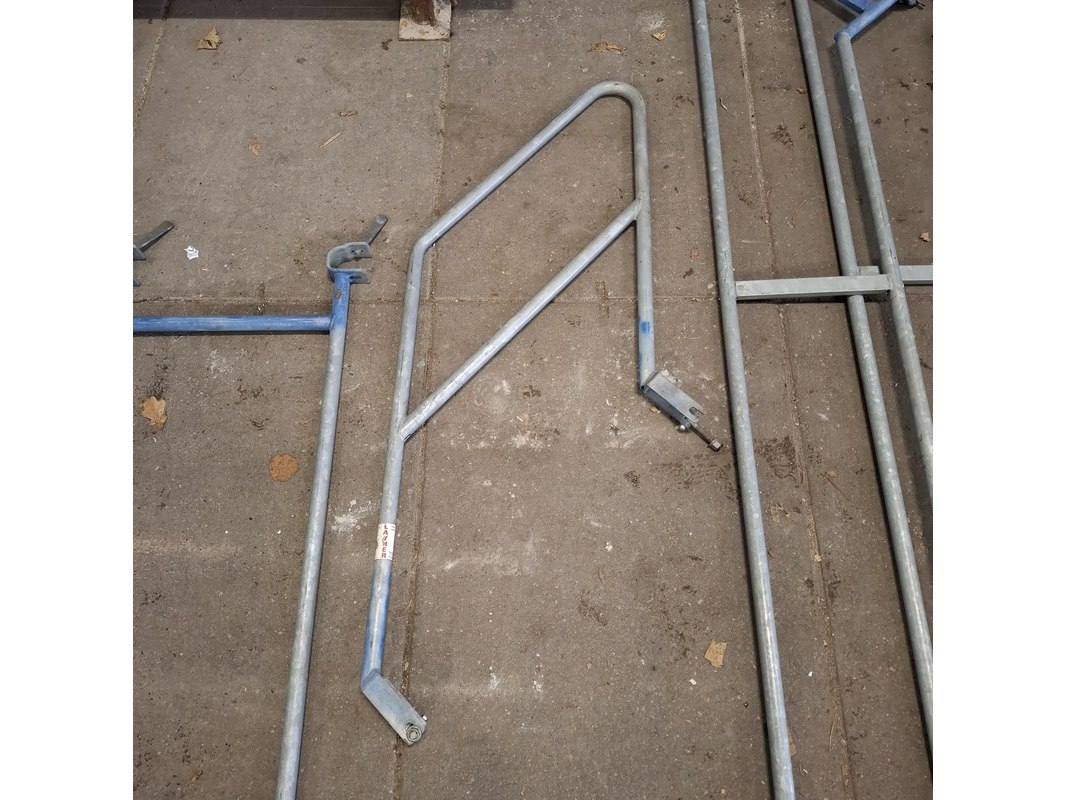 Product: Steigertrap met leuning Conditie: gebruikt Specificaties: (2x lang 307 cm inclusief leuning, 1x kort inclusief leuning en losse leuning) (54 cm steiger, ringafstand)
