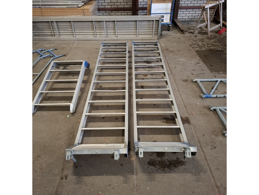 Merk: Layher Product: Steigertrap met leuning Conditie: gebruikt Specificaties: (2x lang 307 cm inclusief leuning, 1x kort inclusief leuning en losse leuning) (54 cm steiger, ringafstand)