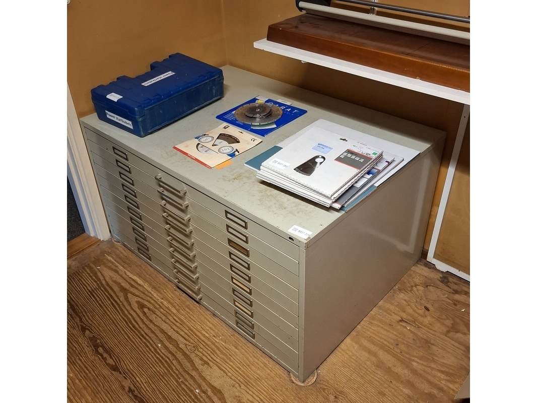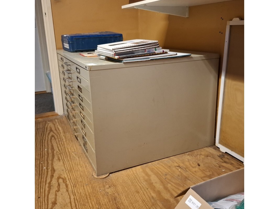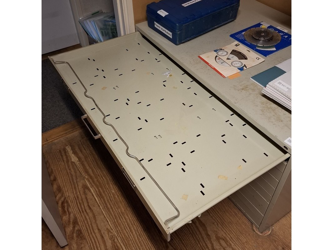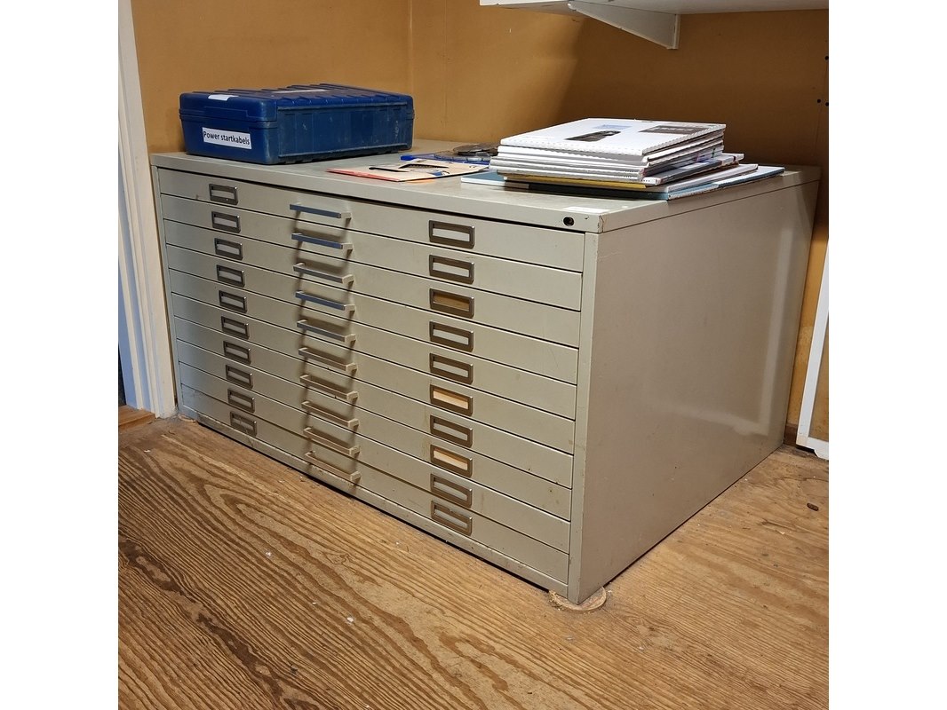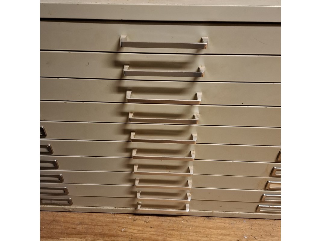 Product: Tekenladenkast Afmeting: hxbxd ca. 72x136x95 cm Conditie: gebruikt Specificaties: 10 laden