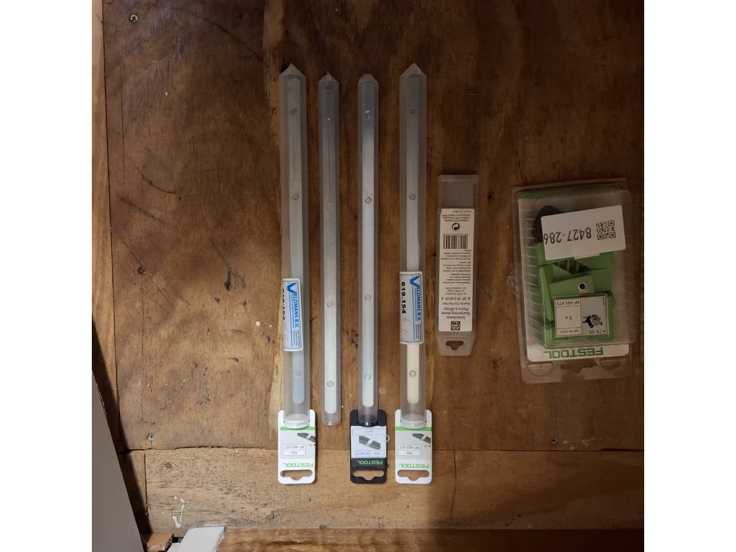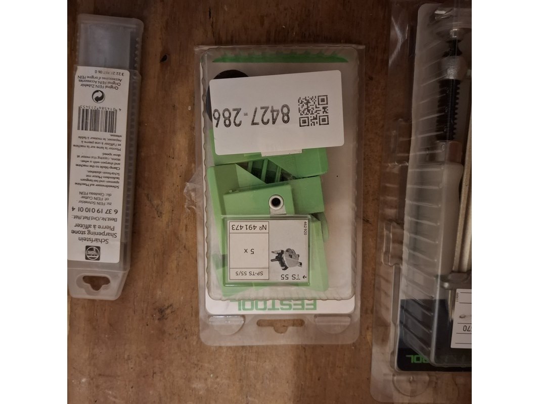 Product: Diverse Festool benodigdheden Specificaties: Bestaande uit: o.a. 2x schroefklem FSZ120-2, 5x splinterbescherming SP-TS 55/5, 4x verbindingsstukken voor geleiderails.