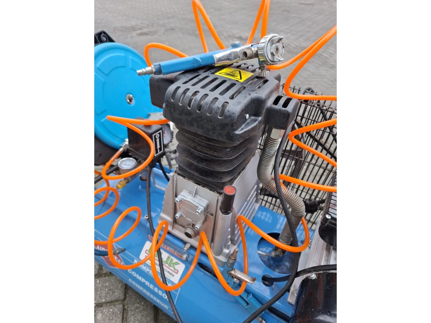 Merk: Airpress Product: Compressor BouwJaar: 2017 Specificaties: max 10bar, inhoud ca 90ltyr, incl. luchtslanghaspel