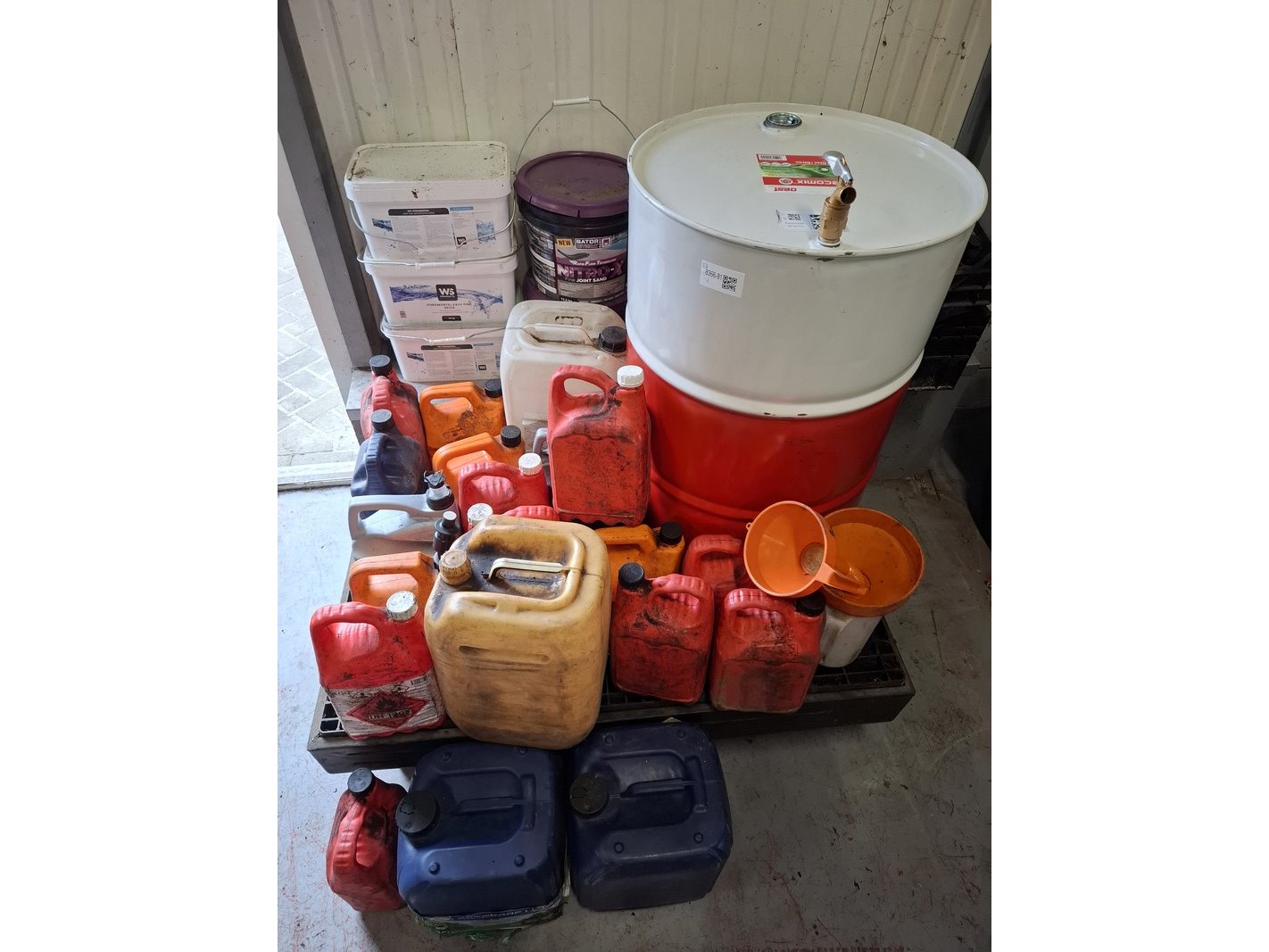 Product: Lekbak 220ltr met diverse vloeistoffen Afmeting: lxbxh ca 85x124x38cm Specificaties: o.a. ca 50 ltr 2-takt benzine (geschat); zaagolie; divers cans deels gevuld; etc.