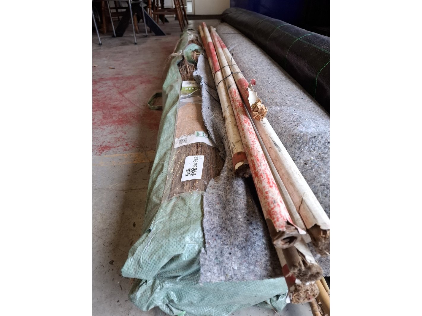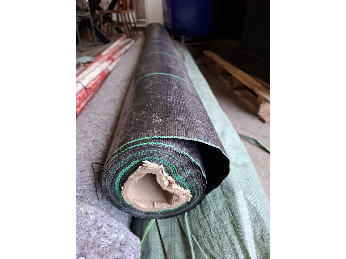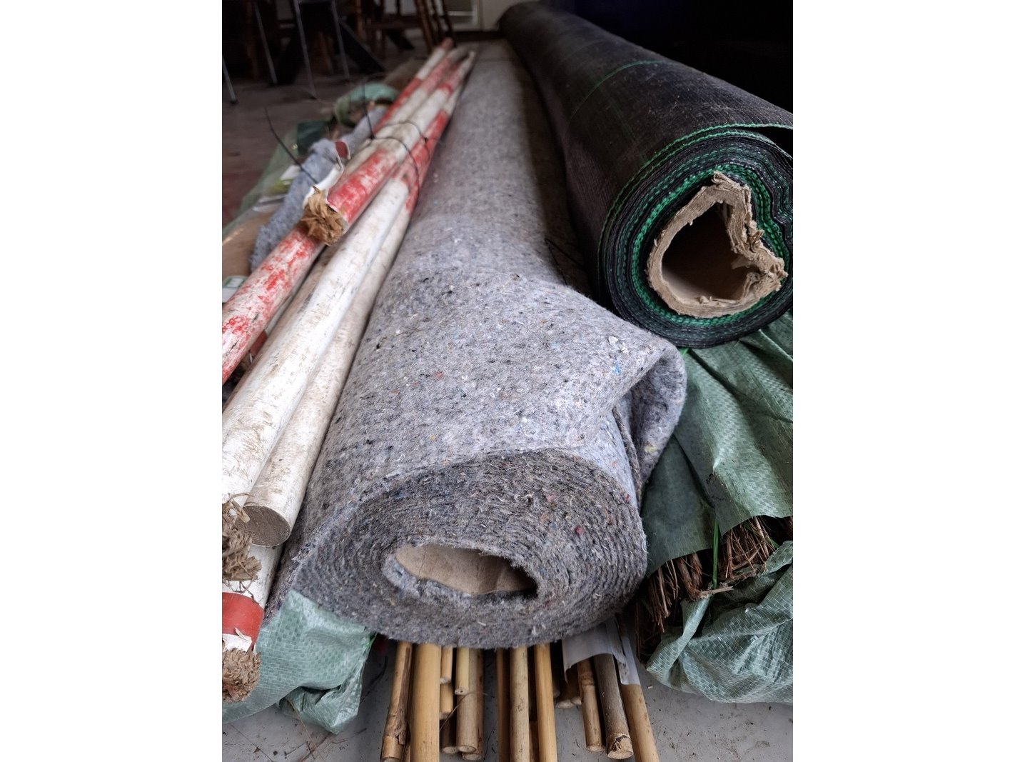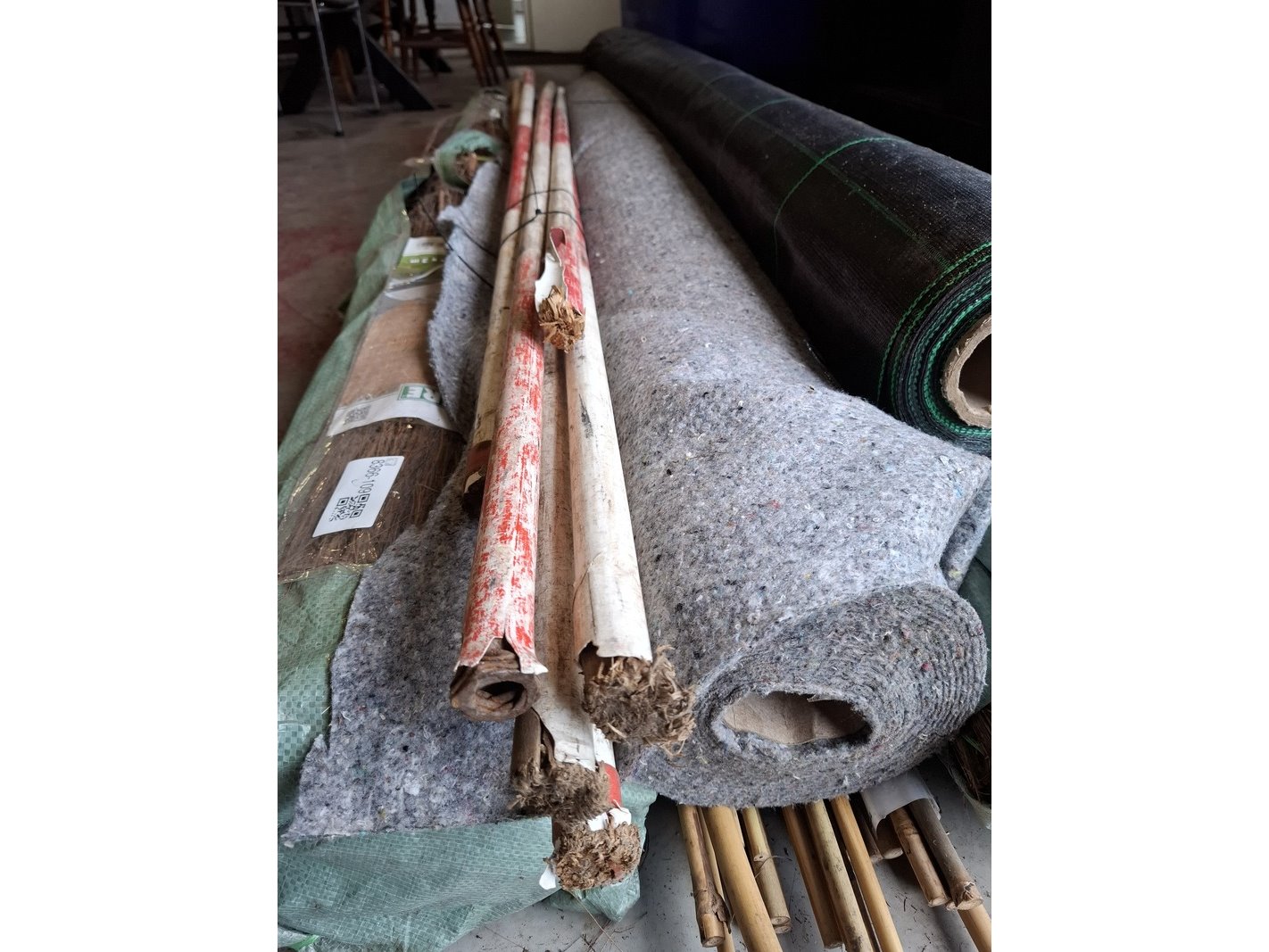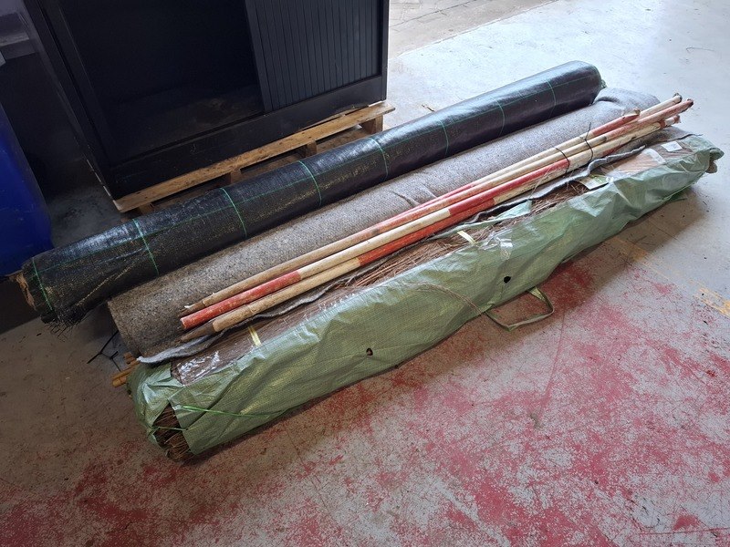 Product: Partij diverse o.a. antiworteldoek Specificaties: o.a. worteldoek aangebroken ca 400cm breed; 2 rol heidemat 2x3mtr, sjalonstokken, druk verdeeldoek