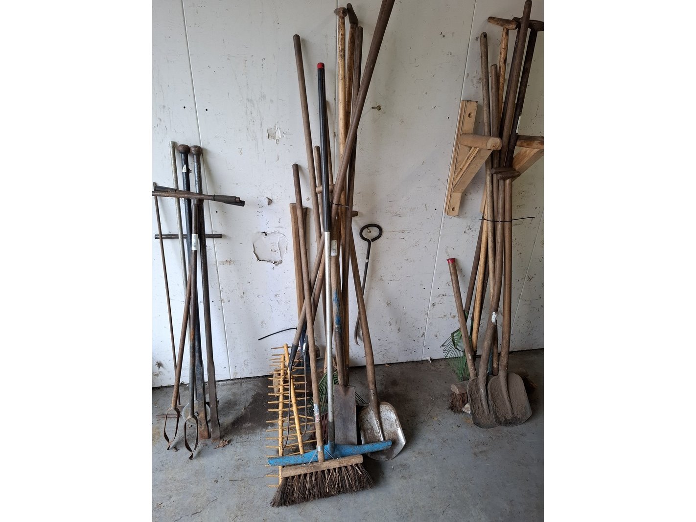 Product: Diverse tuingereedschap Specificaties: o.a. grashark, schoppen, bladhark, slegge, etc.
