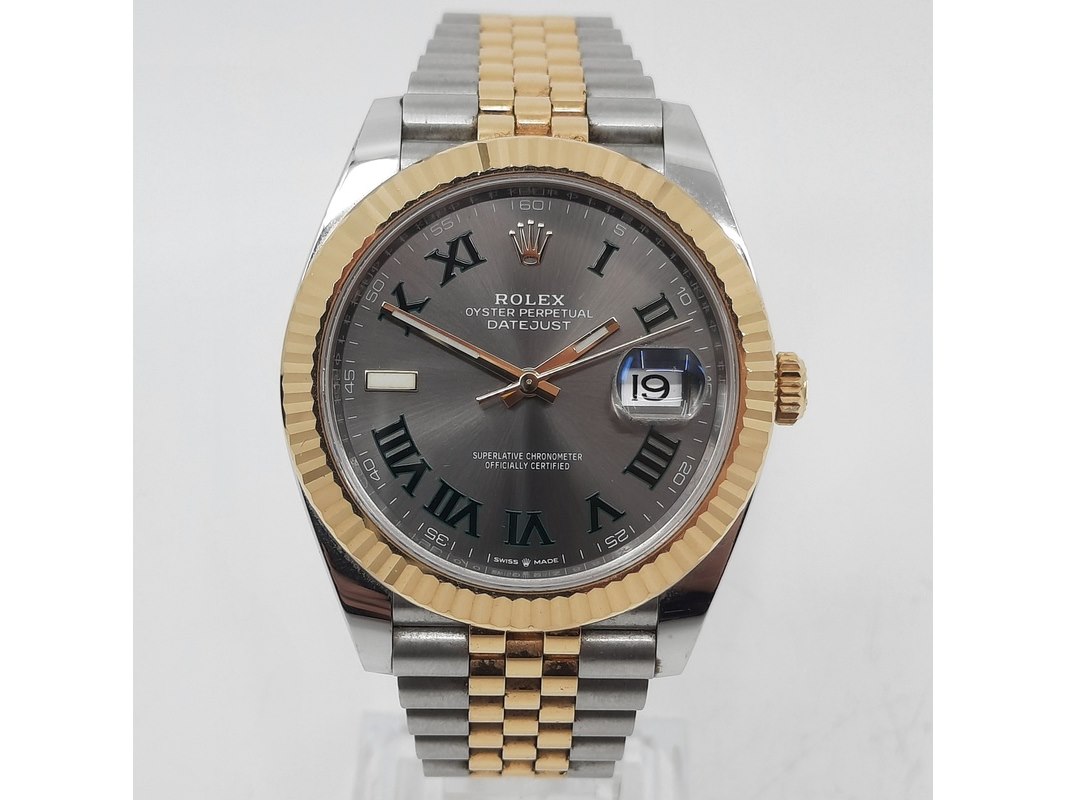 Merk: Rolex Product: Heren polshorloge Conditie: gebruikt Specificaties: Een goud met stalen heren polshorloge, Rolex Datejust II 126333. Met geelgouden geslepen lunet, stalen kast, grijze wijzerplaat, groene Romeinse index, automatisch uurwerk, kaliber 3235 en staal met geelgouden Jubilee model band. Geen doos, inclusief certificaat.