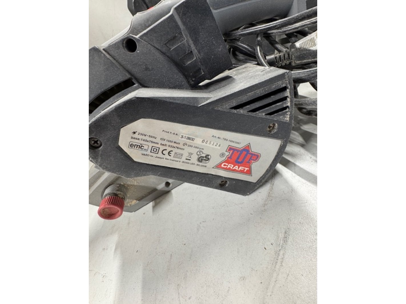 Merk: TopCraft Product: Bandschuurmachine Afmeting: bxdxh ca. 41x17x26cm Conditie: gebruikt