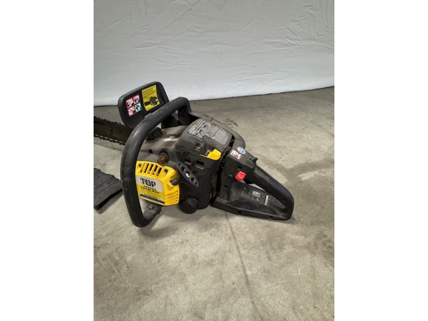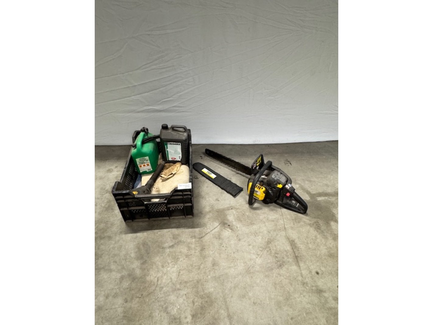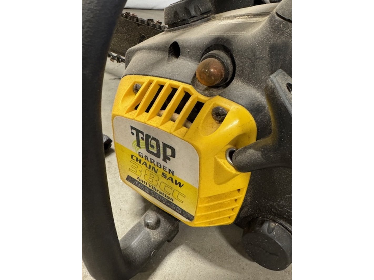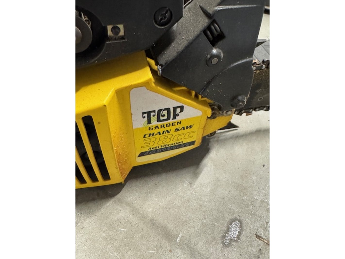 Merk: Top Garden Product: Kettingzaag Kleur: geel Conditie: gebruikt Specificaties: met 2x jerrycan en trechter