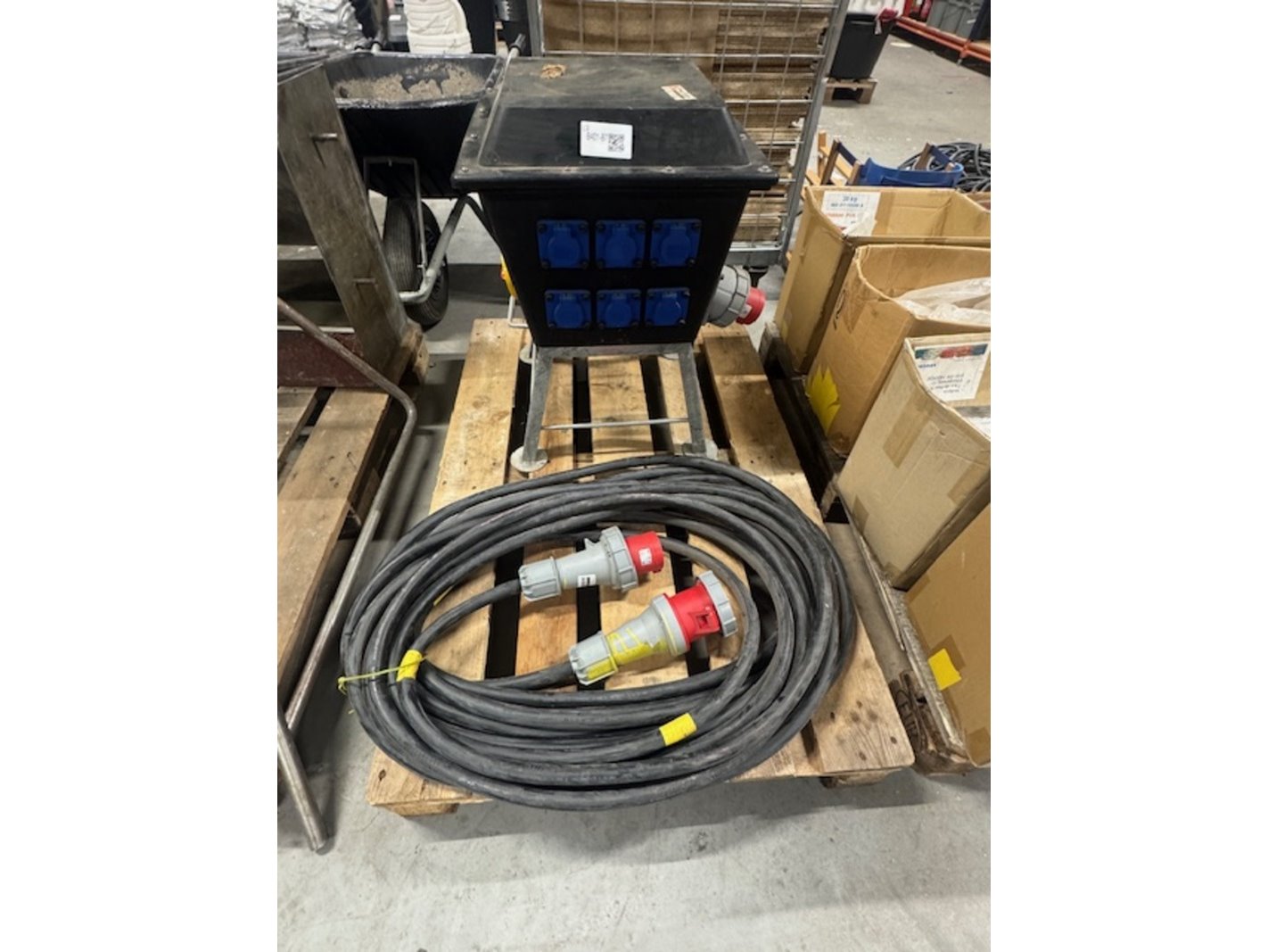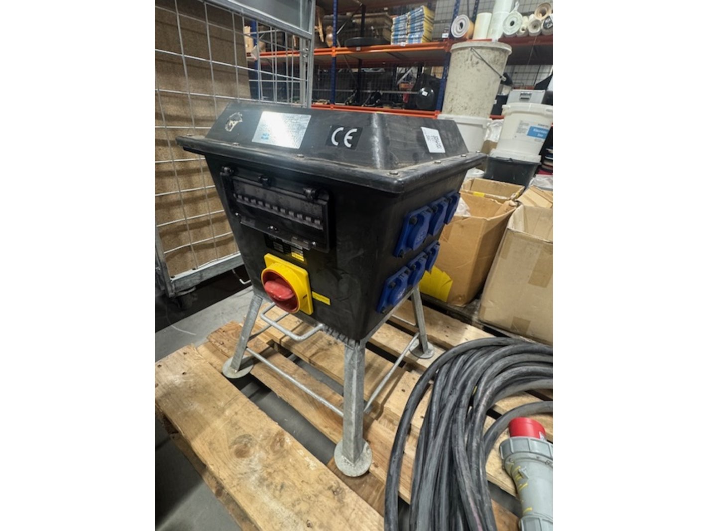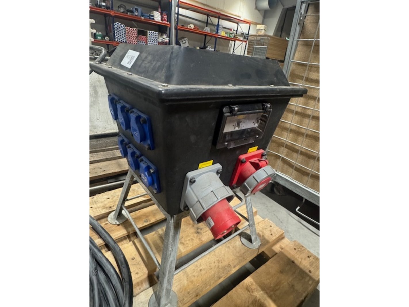 Merk: Bos Elektro Product: Bouwstroomkast en krachtstroomkabel Afmeting: bxdxh ca. 45x45x65cm Conditie: gebruikt Specificaties: snoer 5x10mm2 circa 25 meter. invoer d.m.v. een apparaat contactdoos 5p 63A – doorvoer d.m.v. 1 inbouwcontactdoos 5p 63A – voorzien van hoofdschakelaar 4p 63A – 3 inbouwcontactdozen 5p 32A IP67, beveiligd d.m.v. 1 automaat 32A per contactdoos. De 32A krachtgroepen zijn aardlek beveiligd d.m.v. 1 aardlekschakelaar 63A 0,03A. – 6 inbouwcontactdozen 3p 16A CEE beveiligd d.m.v. 1 automaat 16A per 2 contactdozen. De 16A lichtgroepen zijn beveiligd d.m.v. 1 aardlekschakelaar 40A 0,03A. – robuust stalen frame, zwaar verzinkt, laag model.