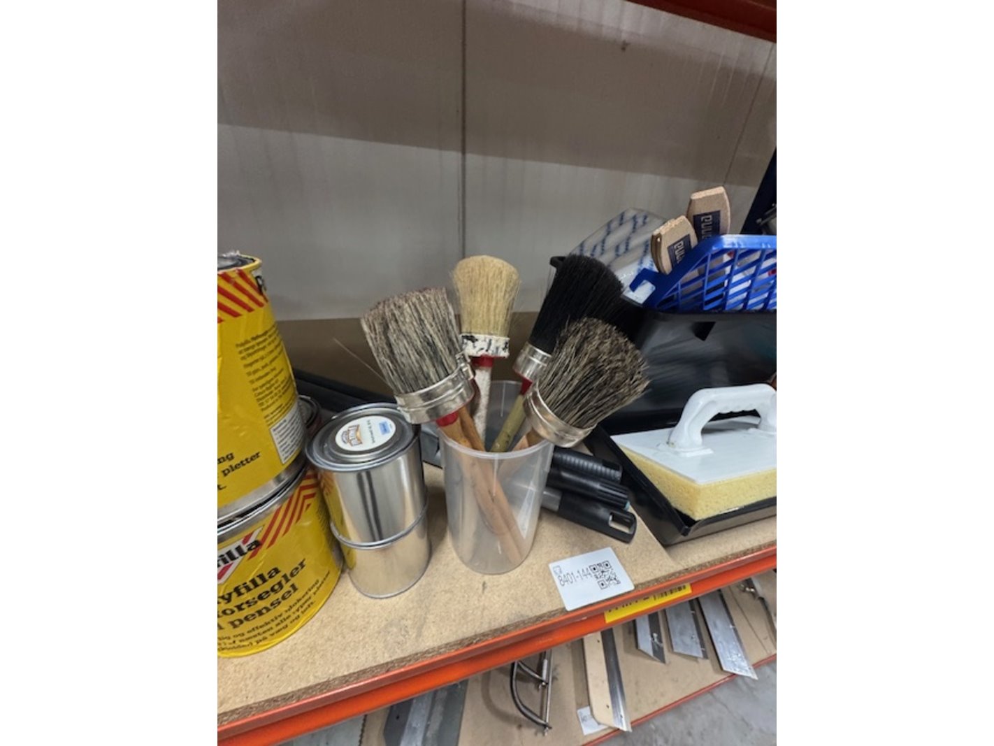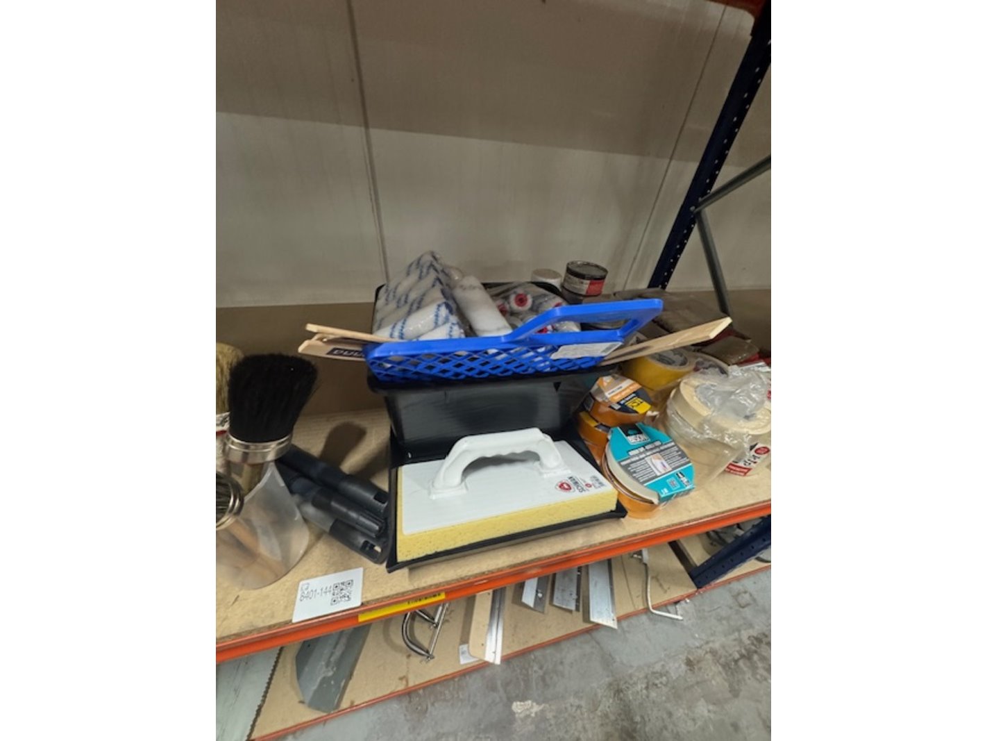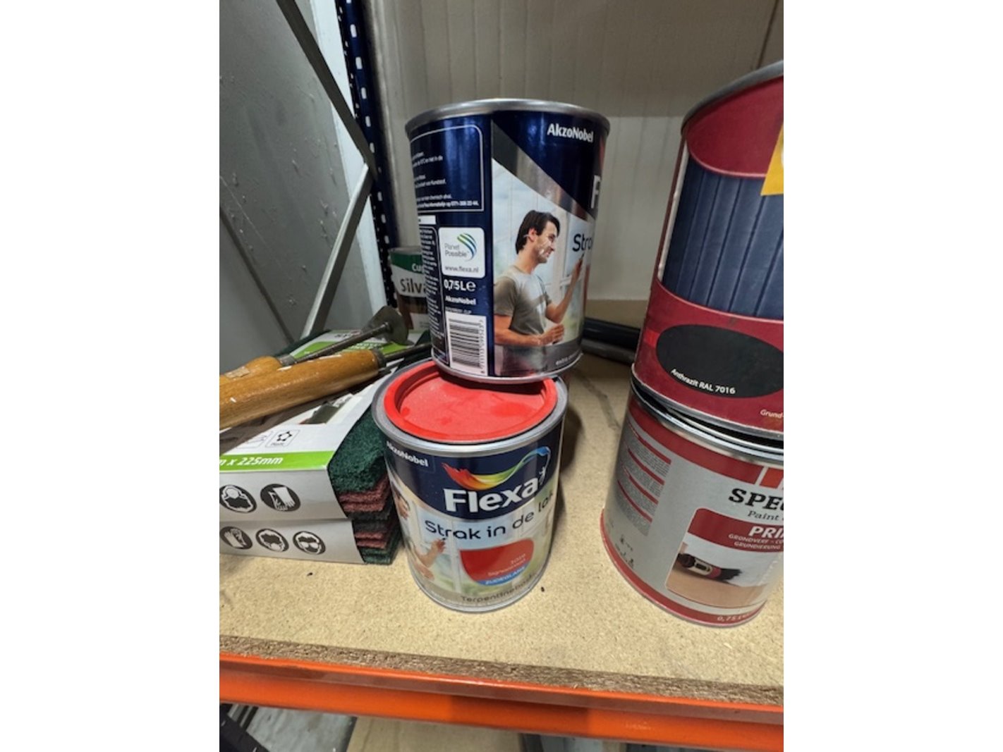 Product: Partij schilders benodigheden en verf Specificaties: o.a.: schuurpads, krabbers, 3x blik verf rood, kwasten, rollers, tape etc.