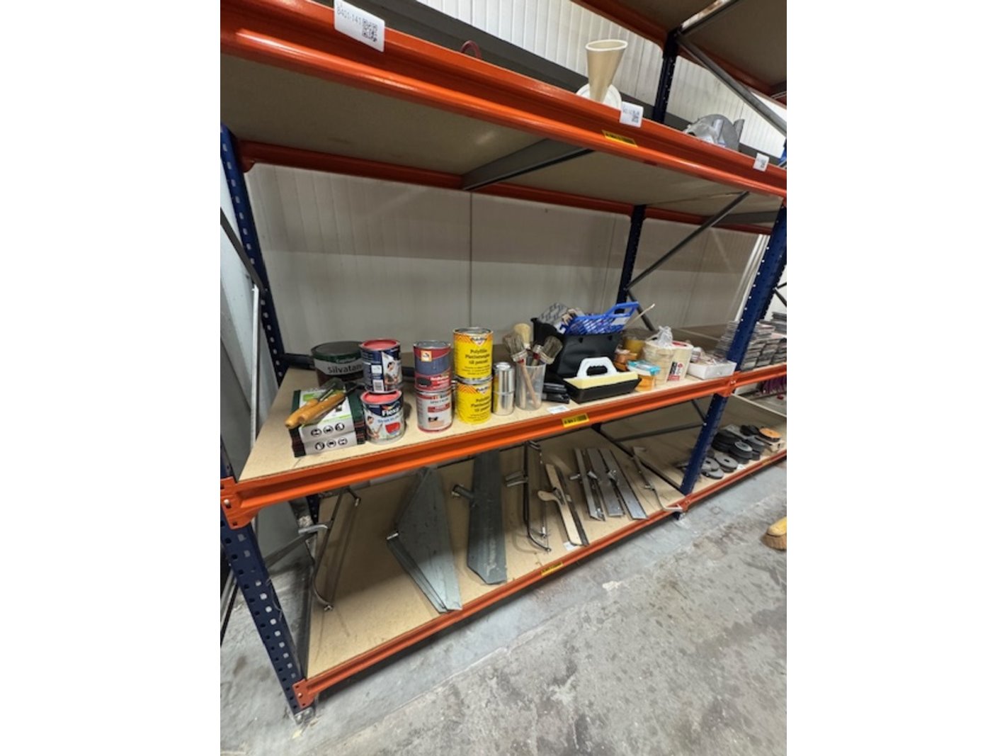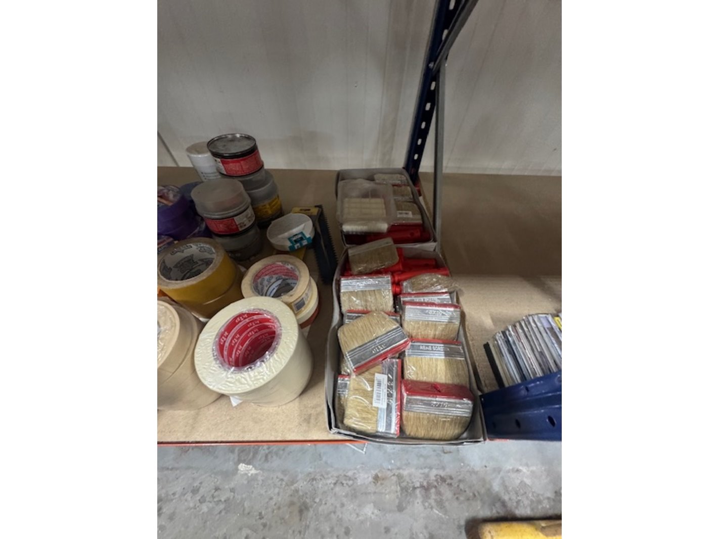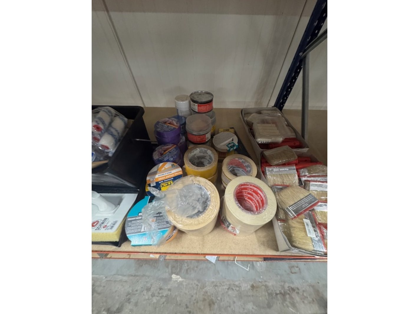 Product: Partij schilders benodigheden en verf Specificaties: o.a.: schuurpads, krabbers, 3x blik verf rood, kwasten, rollers, tape etc.