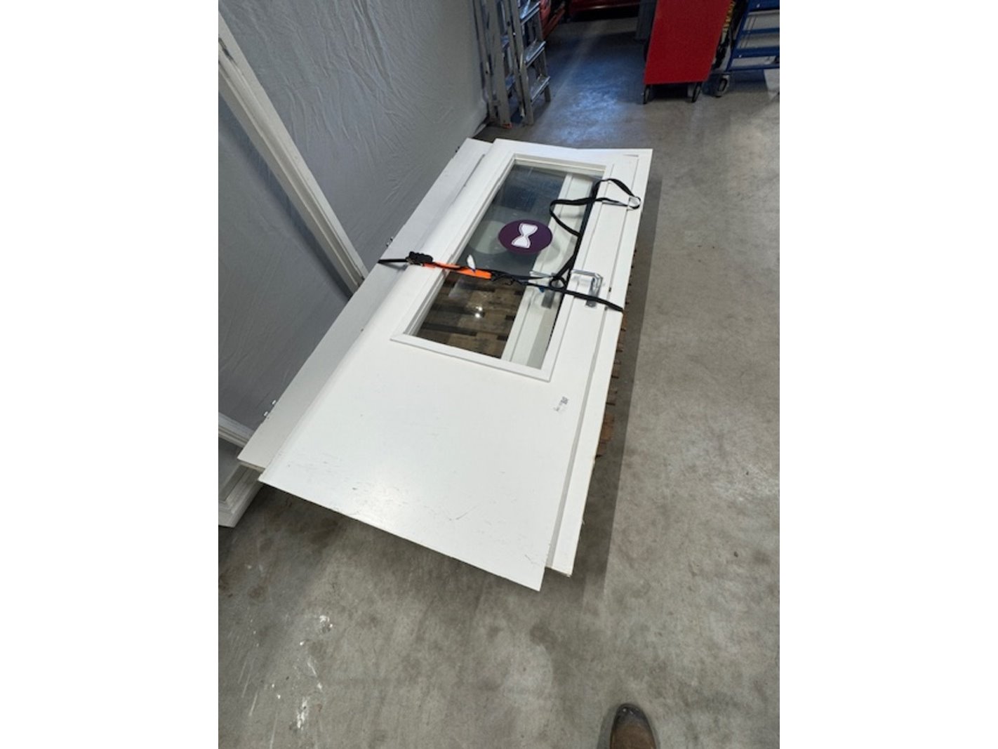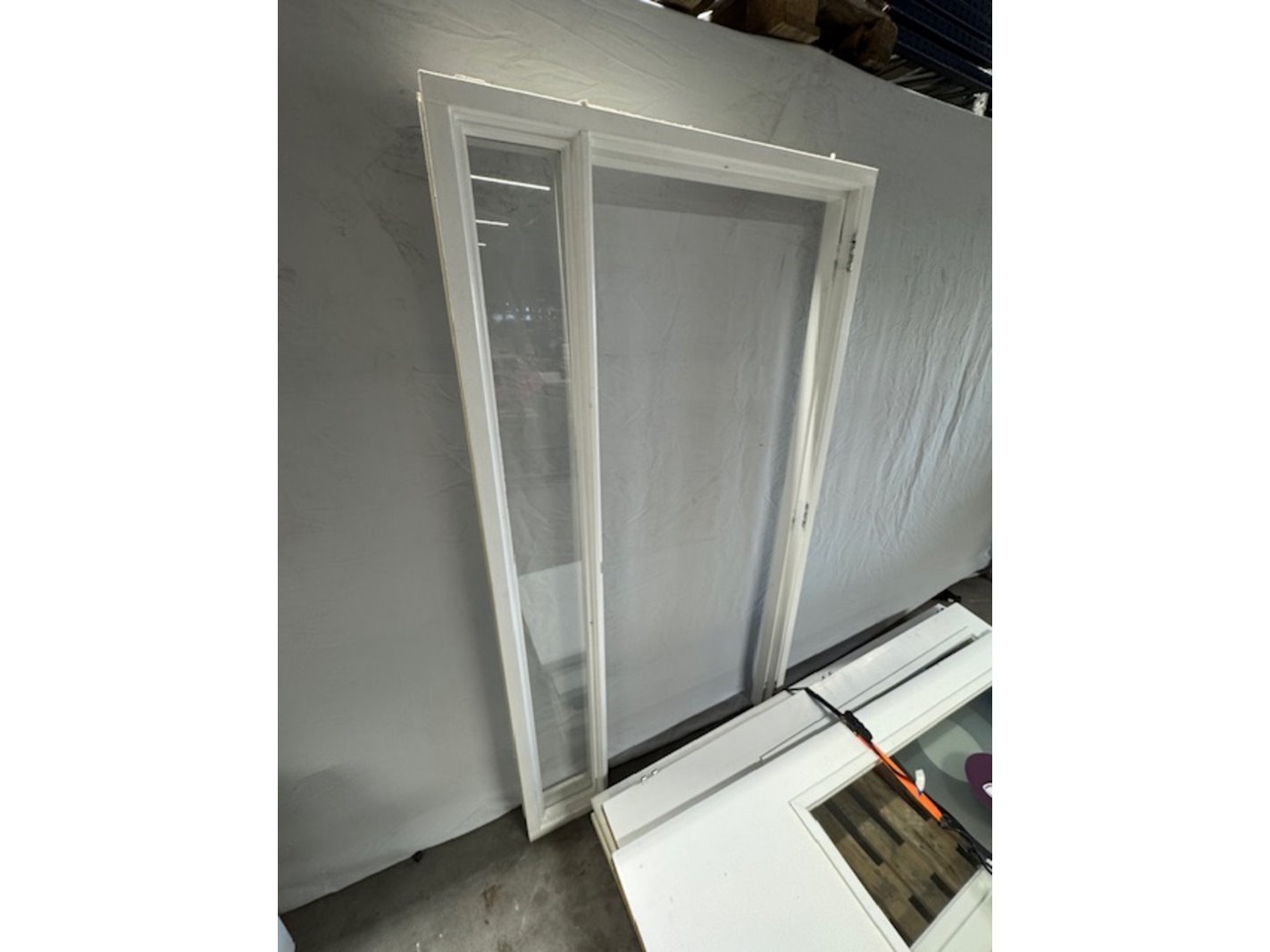 Product: Kozijn met zijlicht en deur Kleur: wit Materiaal: hout Afmeting: bxh ca. 120x220cm Conditie: gebruikt